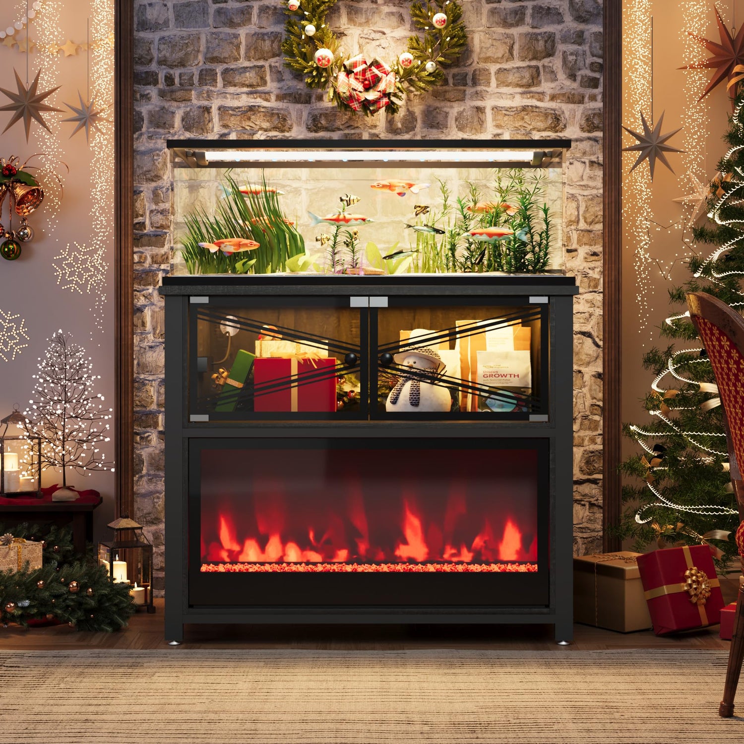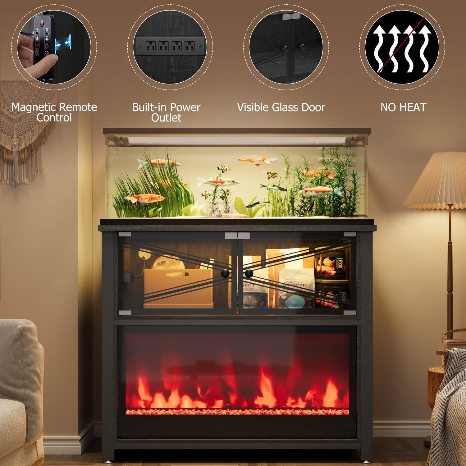 40-50 Gallon Fish Tank Stand with 20-Color LED Flames, No Heat, Metal Frame Structure Aquarium Stand, Glass Doors Storage Cabinet Holds Up to 700 LBS, Fit for Turtle Tank, Reptile Tank (Black)