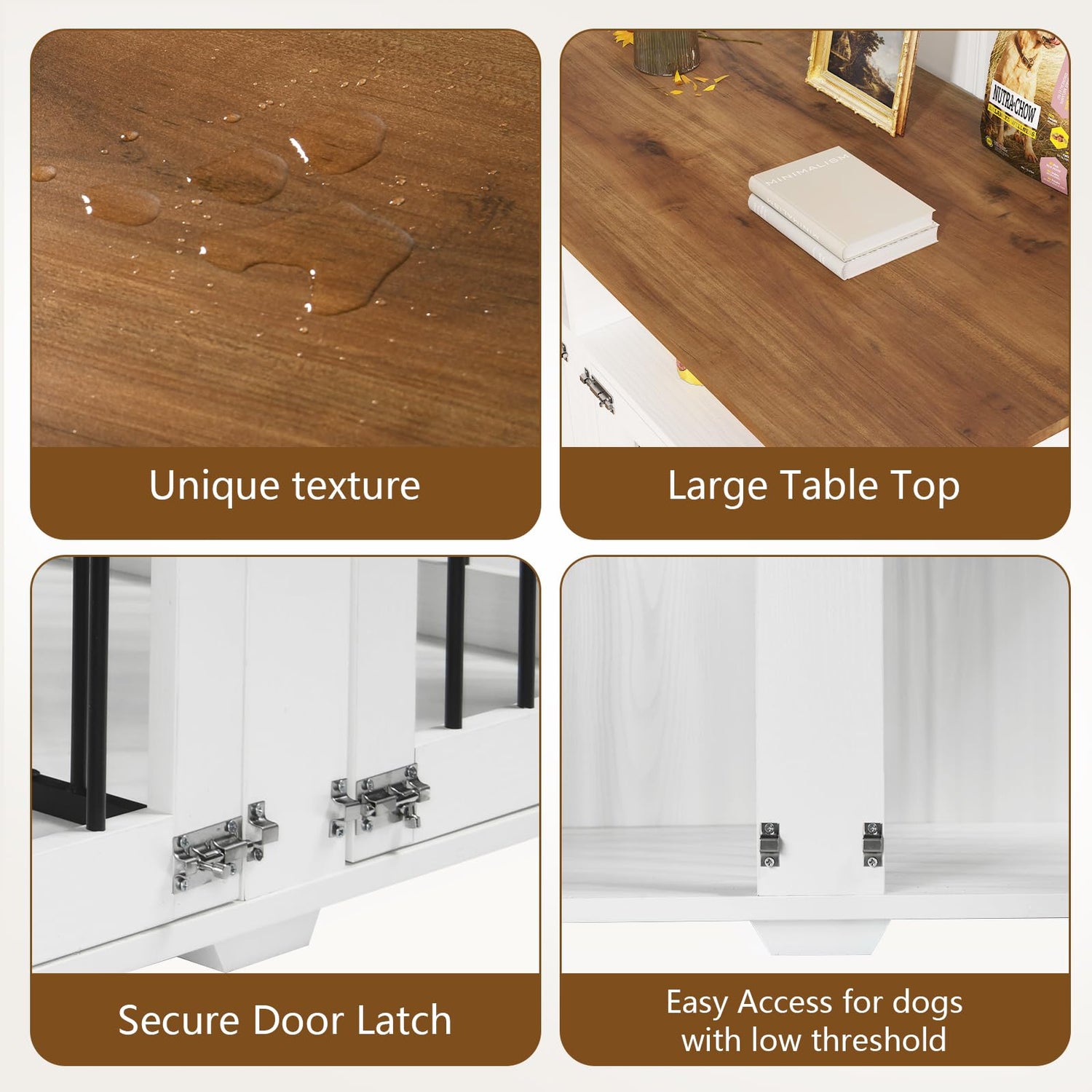 The dog kennel door locks securely to prevent escape, and the switch is simple to operate for easy feeding. And this dog crate furniture is made of durable wood and thick steel tubing, the thickened tabletop material can hold up to 150lbs and has a high load bearing capacity, which makes it stronger and more resistant to chewing than ordinary wooden dog crate end table.