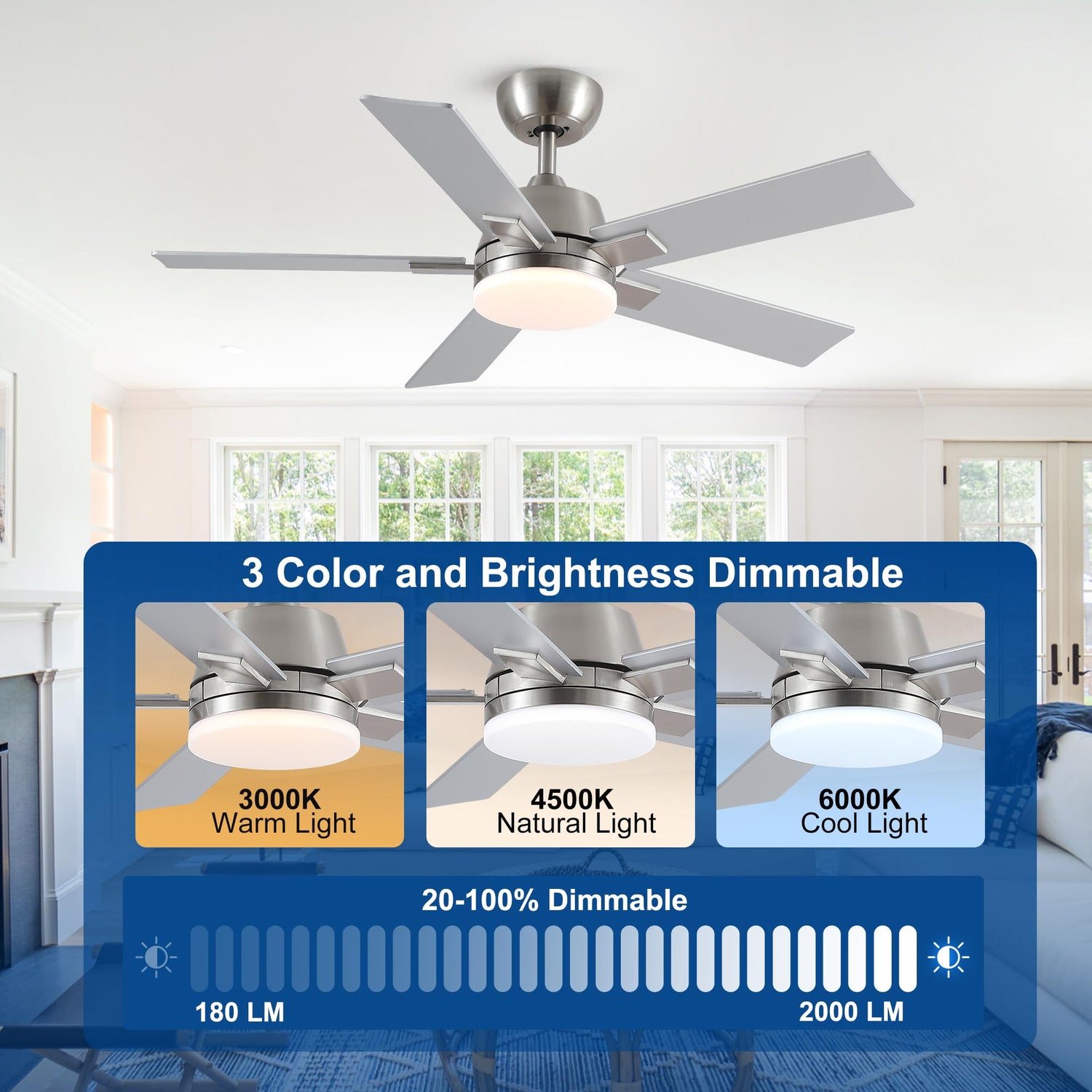42 Inch Ceiling Fans with Lights and Remote, Brushed Nickel Ceiling Fan, 6 Speed Reversible DC Motor, 3CCT Dimmable LED, Modern Design for Bedroom, Living Room & Covered Outdoor,Includes Downrod