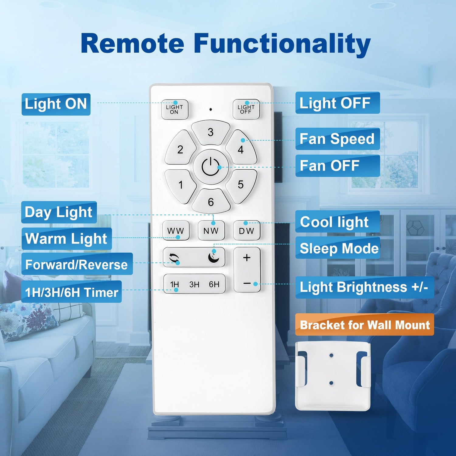 - 【Convenient Remote Control 】The included remote control allows you to adjust fan speed (1-6 levels), light brightness, and color temperature with ease. Enjoy added convenience with a 1/3/6-hour timer, sleep mode, and reversible airflow function for optimal air circulation in any season.