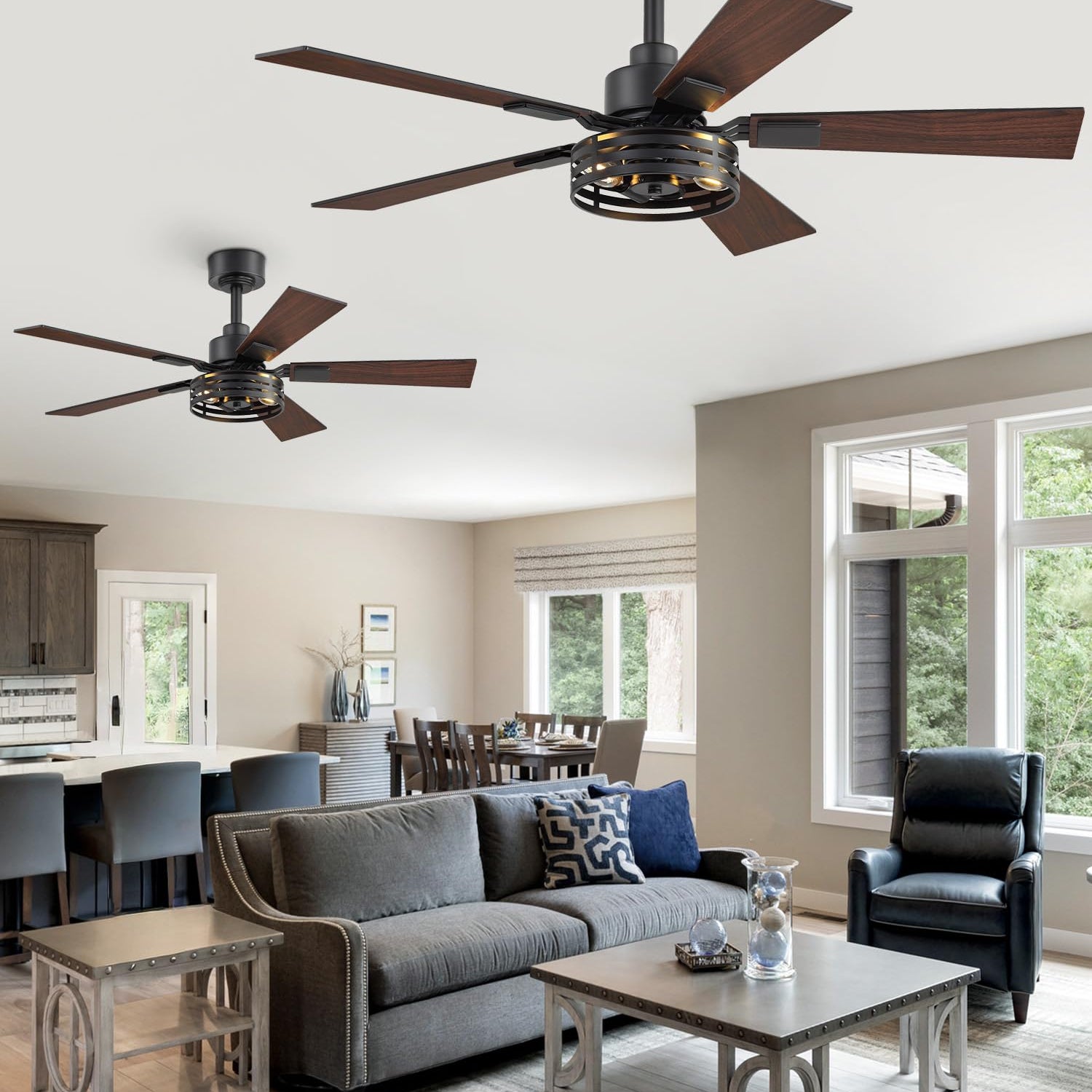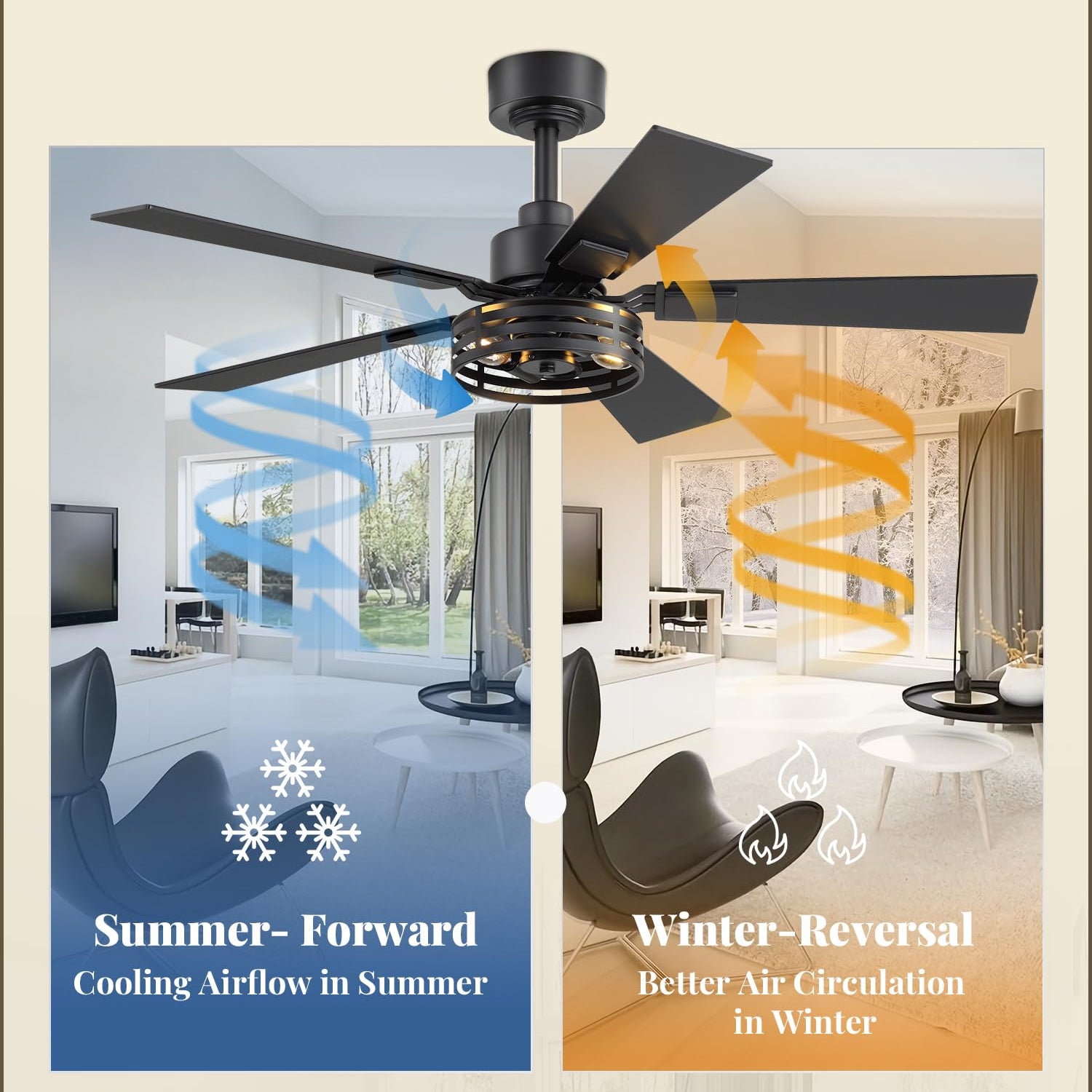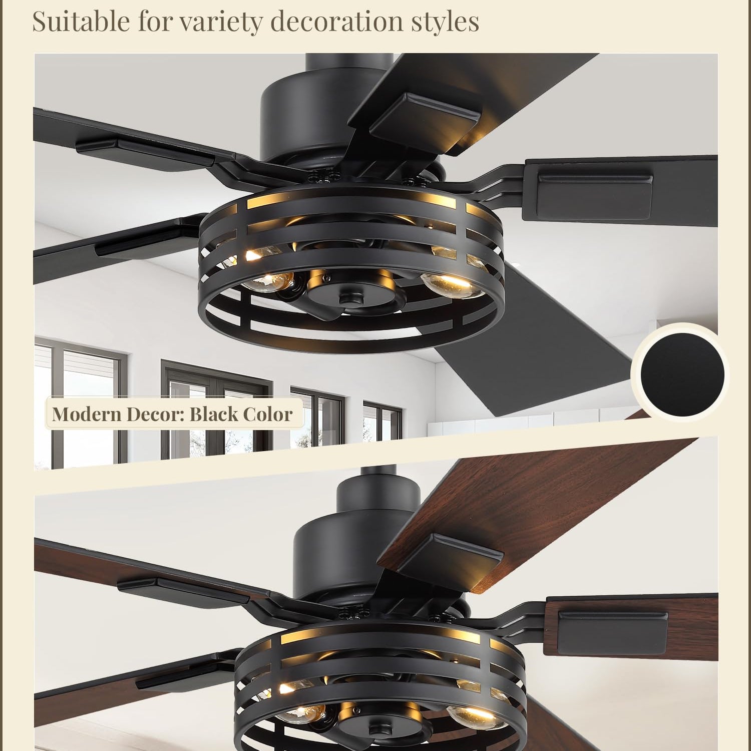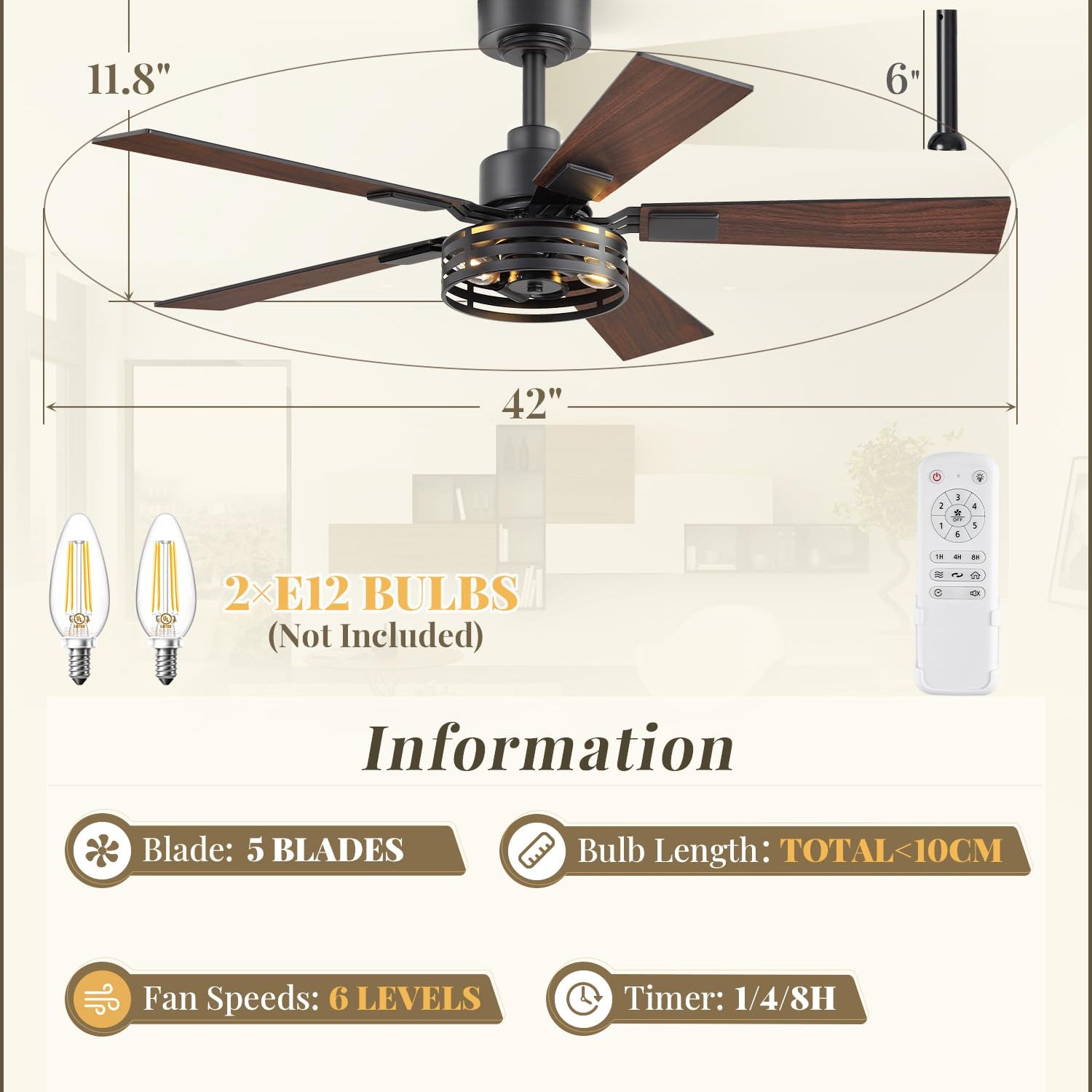 - Classic Farmhouse Design: This 42-inch caged ceiling fan features 5 dual-finish blades, including 2 double-sided blades to match any room decor. The decorative cage with 2×E12 bulb bases (bulbs included) creates a warm farmhouse look, perfect for bedrooms, living rooms, kitchens, dining areas, or covered patios.