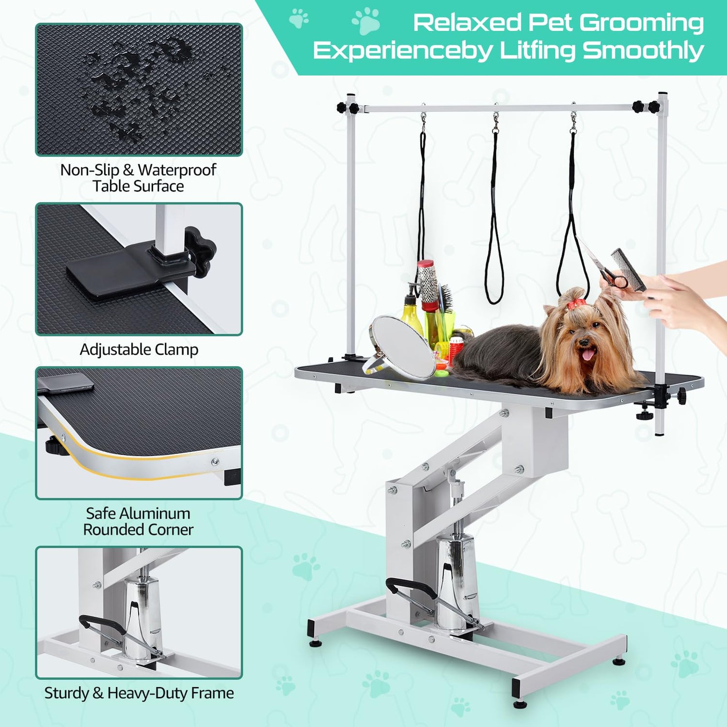 - 🐕🦺【Easy to Adjust】 Table lift is extremely stable, making the hydraulic lift dog grooming table range larger and more stable, and the table height can be changed from 22" - 38.6" in a few seconds.
