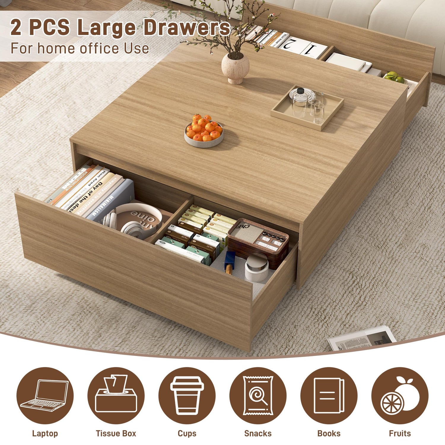 - 2. Clever Dual Drawer Storage: This minimalist square coffee table features two spacious drawers (each 15.8 inches wide x 7 inches deep). Internal dividers create compartmentalized storage, allowing you to easily organize items like remote controls, magazines, and board games for easy access. Hidden storage creates a neat and elegant look.