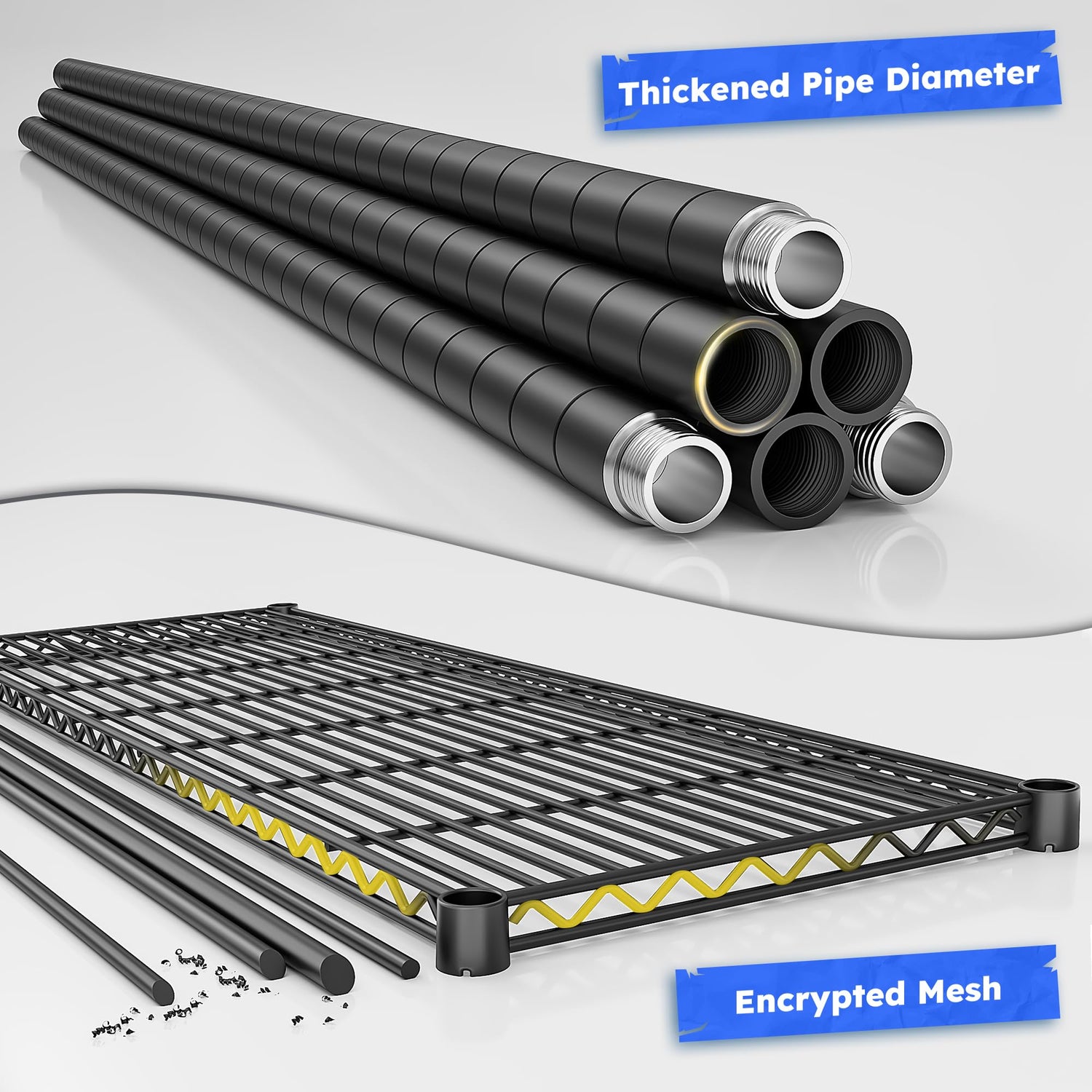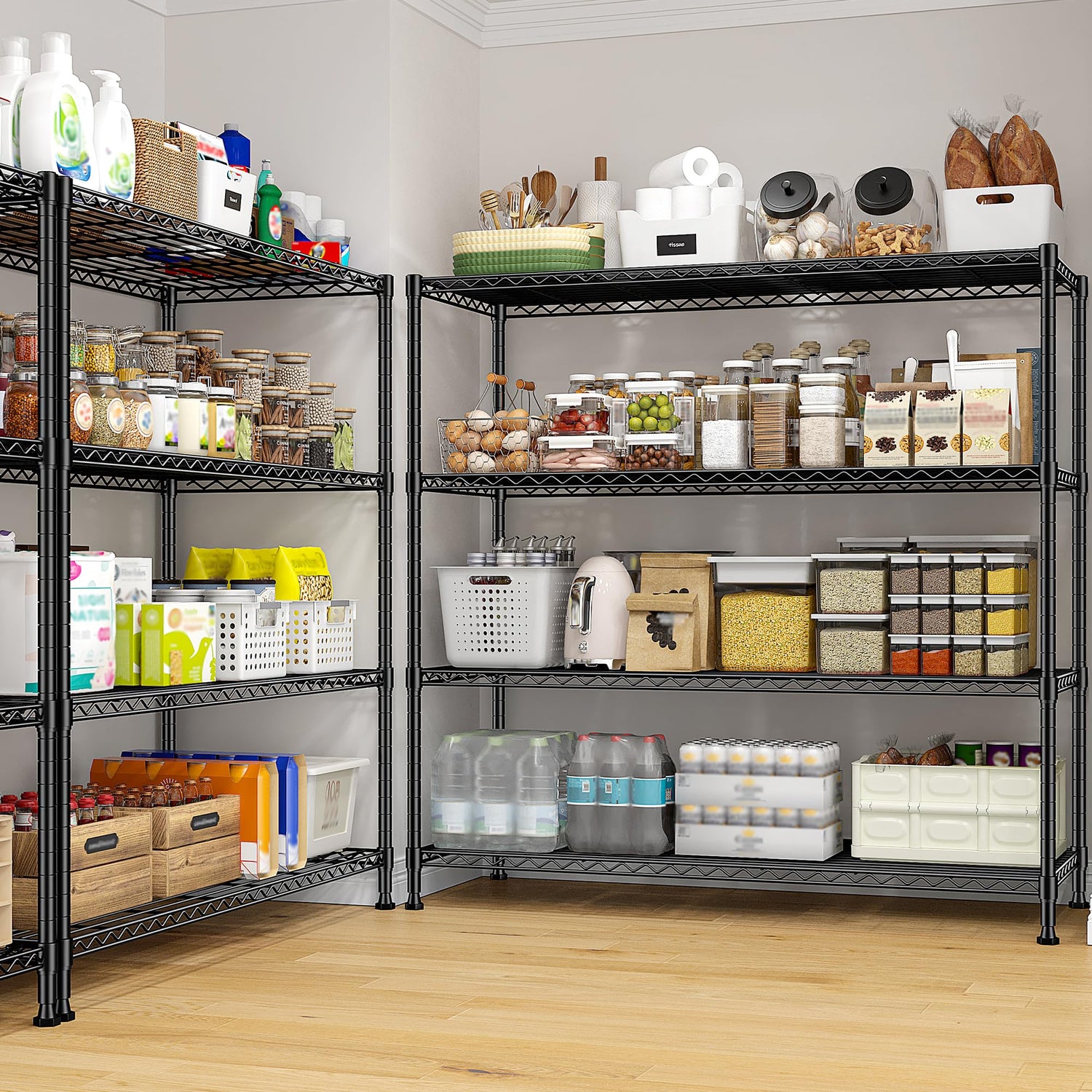 - 45”W Extra-Wide Storage Shelves:Our wire closet shelving measures 45”W × 13.5”D × 59.4”H—offering nearly twice the capacity of standard black shelves. The 45-inch ultra-wide design easily stores bulky kitchenware, toolboxes, green plants, bulk food packs, seasonal clothing, files,books and more, making it perfect for home or commercial use.