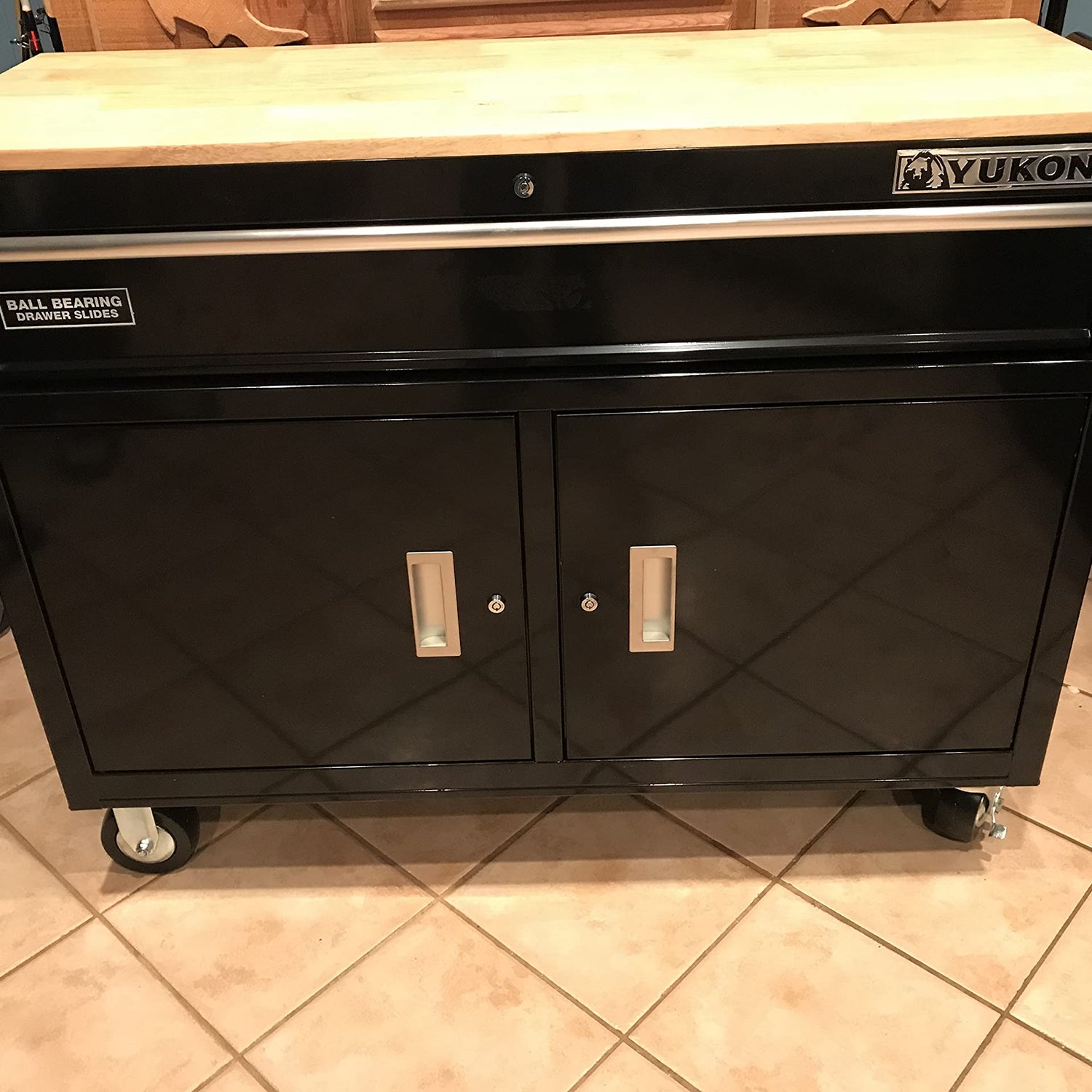 Details: This Yukon 46 in. Mobile Workbench has a two-door cabinet for bulk storage. Made with heavy gauge steel, heavy duty drawer slides and a high load capacity, the mobile workstation has a solid wood top with a large surface area. The large capacity drawer has ball-bearing slides for smooth action. The bulk storage cabinet has plenty of space for large tools and supplies.