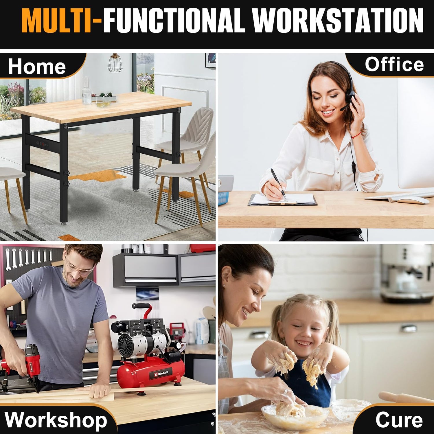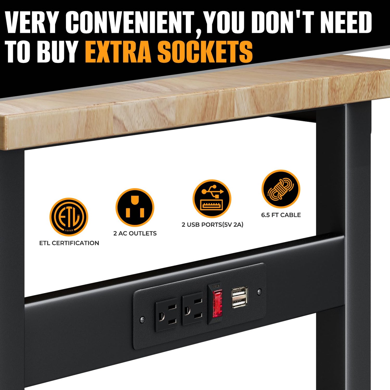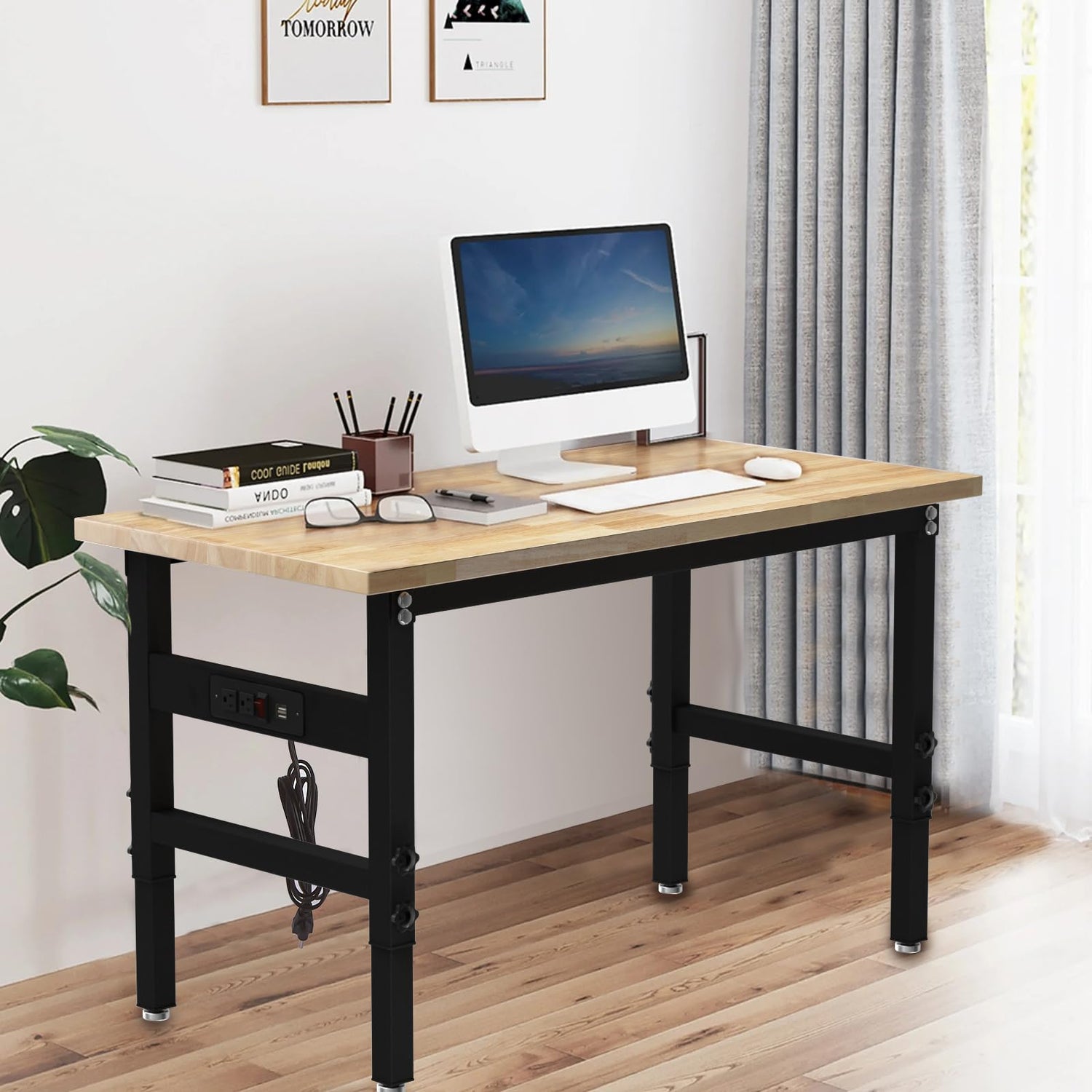 47.5" Adjustable Workbench, Rubber Wood Top Workbench with Power Outlet, Portable Heavy-Duty Work Bench for Garage, Workshop, Office, Home - 2000 lbs Capacity
