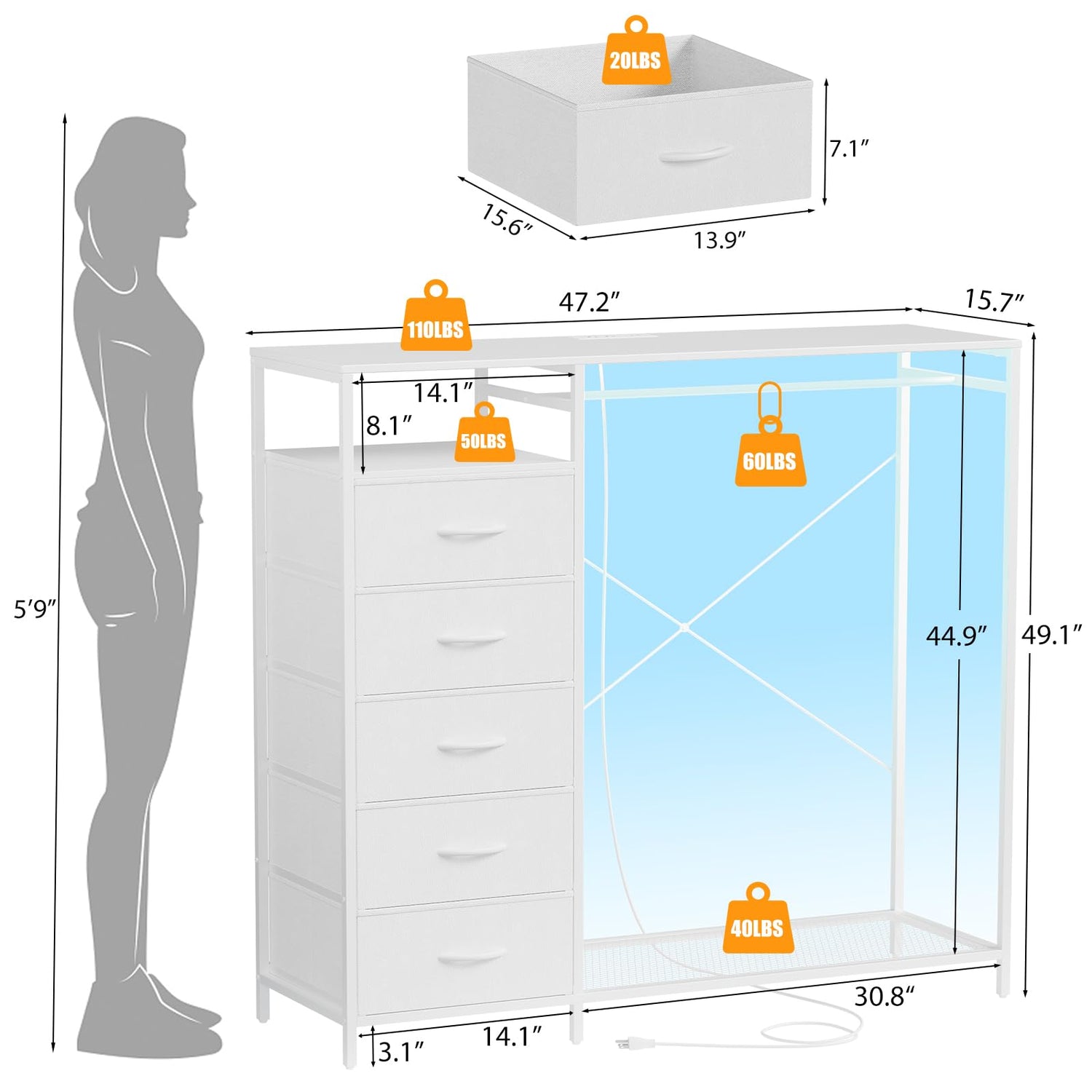 47 Inch White Dresser with LED Lights & Hanging Rack, 5 Drawer Fabric Dresser with Charging Station and Shelves, Tall Closet Organizer for Bedroom Clothes Storage