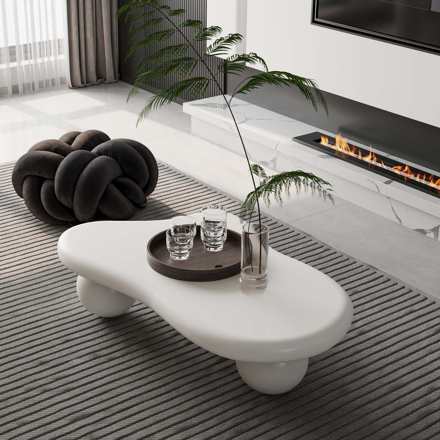 47" Modern White Coffee Table Cloud Shape Low Center Table Cute Irregular Indoor Tea Table with 3 Ball Legs for Living Room Small Space