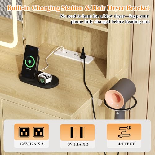 - Convenient Charging Station: The makeup desk is equipped with 2 USB ports and 2 AC power outlets, eliminating the need for extra power strips and preventing cable clutter. You can easily charge your phone while doing your makeup or working, ensuring you never leave home with a low battery. The fixed hairdryer holder also makes it convenient to find your hairdryer when you need it, saving you time and hassle