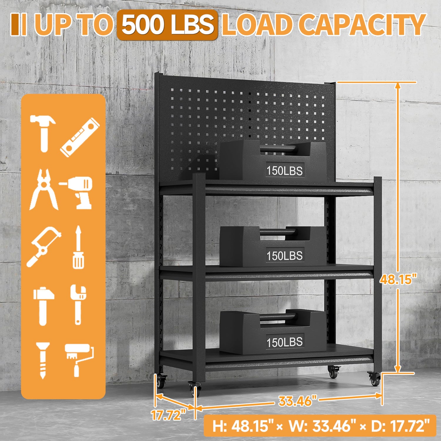 48.15" H Adjustable Workbench with Pegboard,3-Tier Heavy Duty Work Table with Wheels,Black Rolling Workshop Bench,Mobile Garage Workstation, Metal Tool Bench for Garage Warehouse Workshop