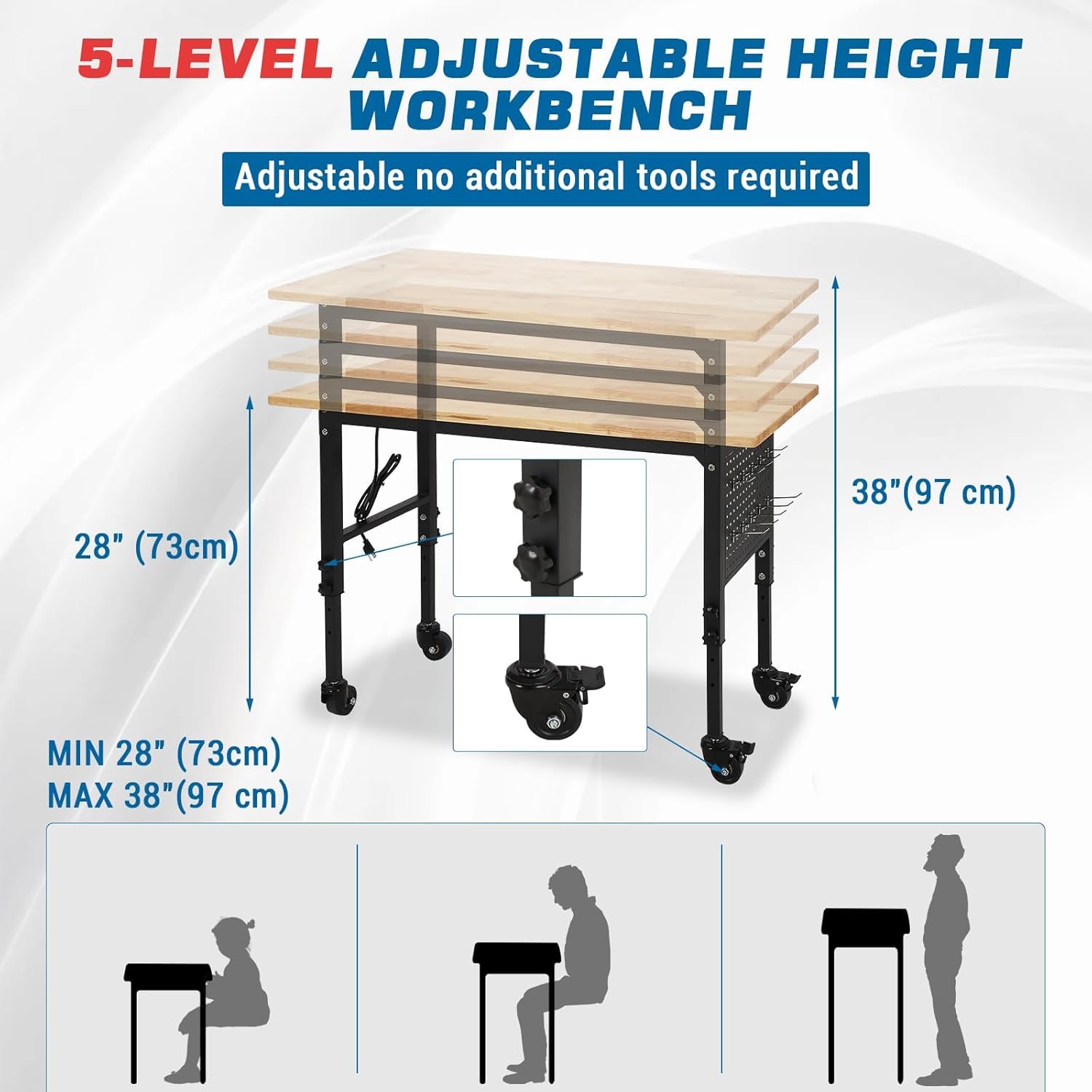 48" Heavy-Duty Height Adjustable Workbench, 2000 Lbs Capacity Hardwood Worktable Work Bench with Power Outlets, Brake Wheels for Garage Workshop Office Home Woodworking Shop