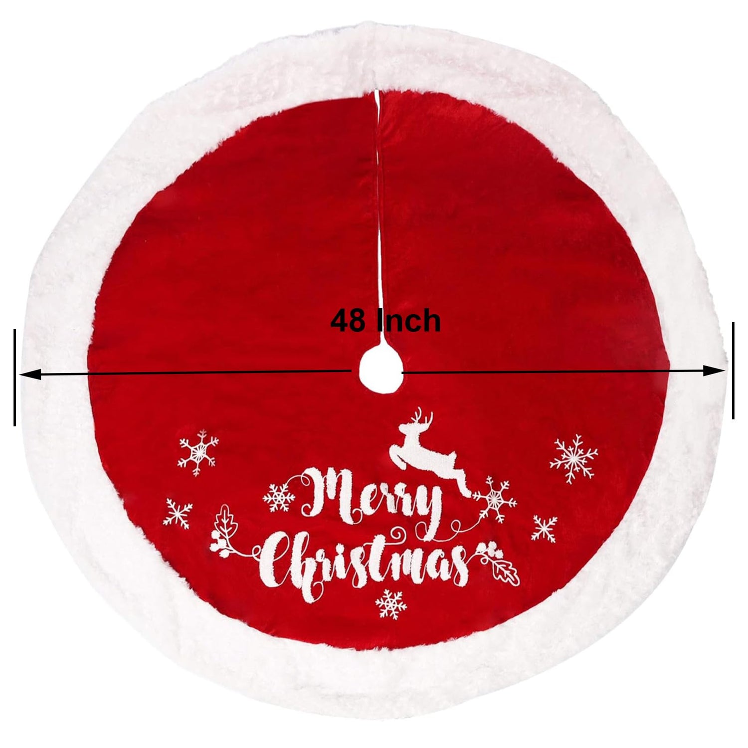 - Two-Tone Design:This exquisite two-tone plush Christmas tree skirt combines elegance and festive charm,the plush white fur mimics the look of freshly fallen snow,the main part of the skirt is crafted from rich red faux fur,which adds warmth and depth to your decorations.