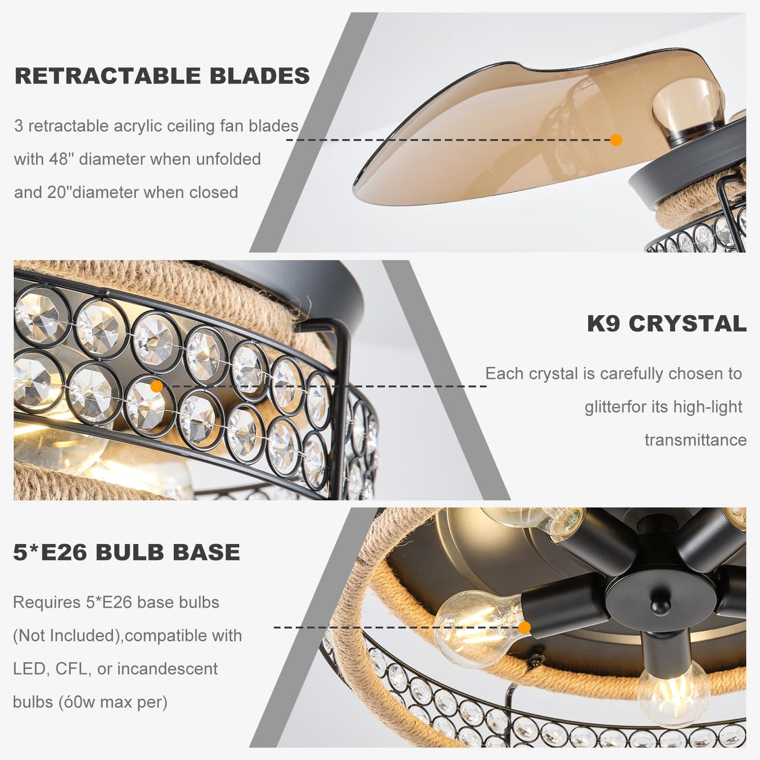 48 Inch Retractable Ceiling Fans with Lights and Remote, Industrial Black Fandelier with 3 Retractable ABS Blades, Invisible Crystal Chandelier Fan for Bedroom Living Room Dining Room (Hemp Rope)