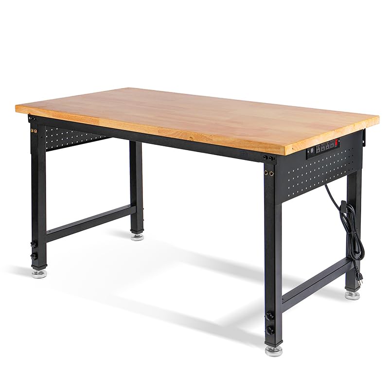 48" L×24”W Adjustable Workbench, 28”-40”Heights Heavy Duty Table 2000 LBS Load Capacity, Work Bench with Power Outlet & Pegboard, Rubber Wood Work Table for Garage, Office, Workshop, Home