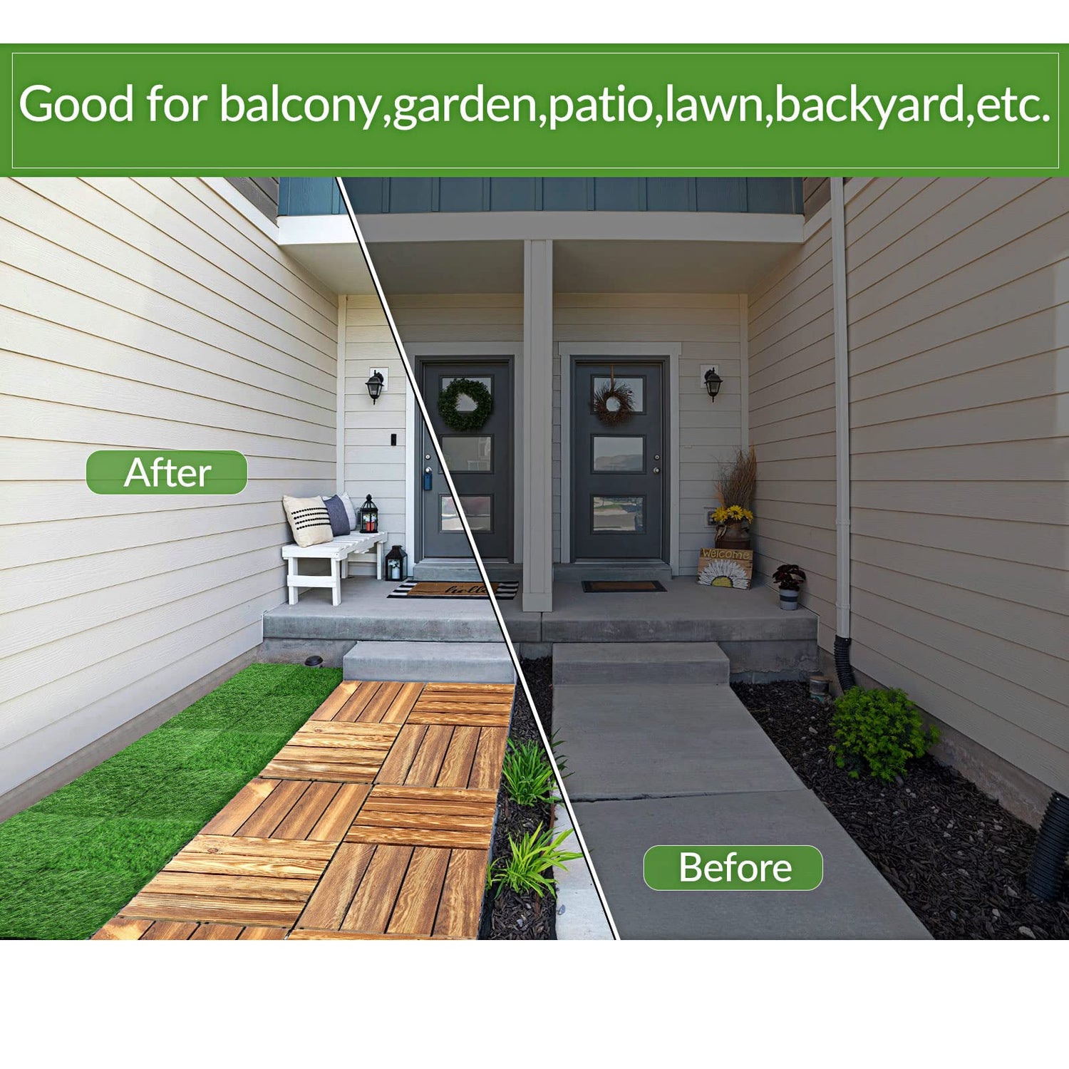 - Package Includes: you will receive 24 pieces wood interlocking deck tiles and 24 pieces interlocking artificial grass turf tiles; These patio floor decking tiles can be spliced freely as needed to create a relaxing area for enjoying peace of mind