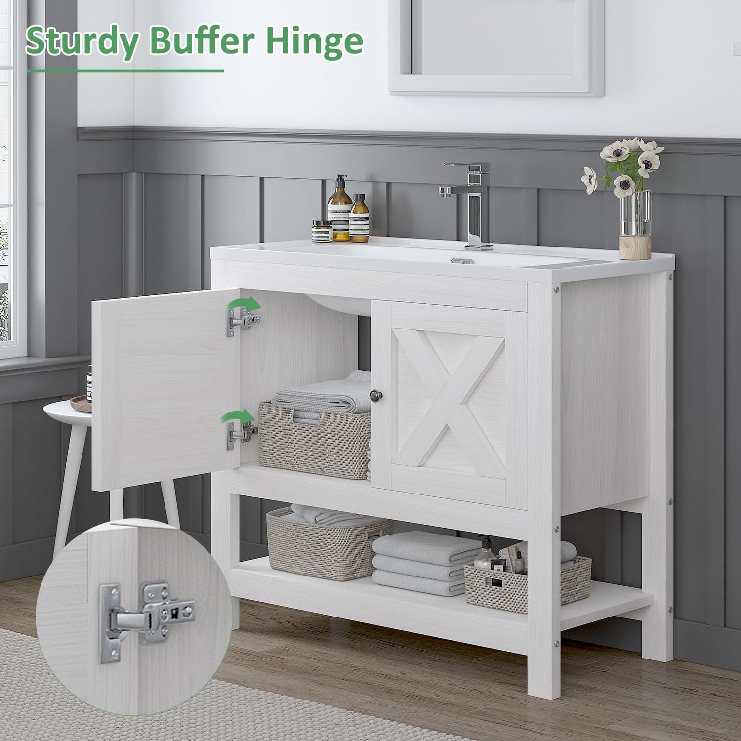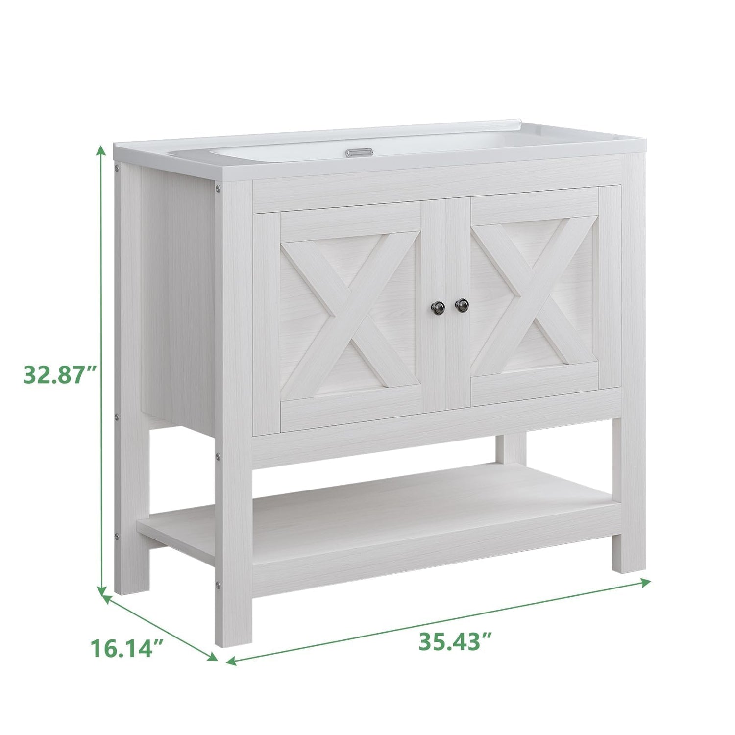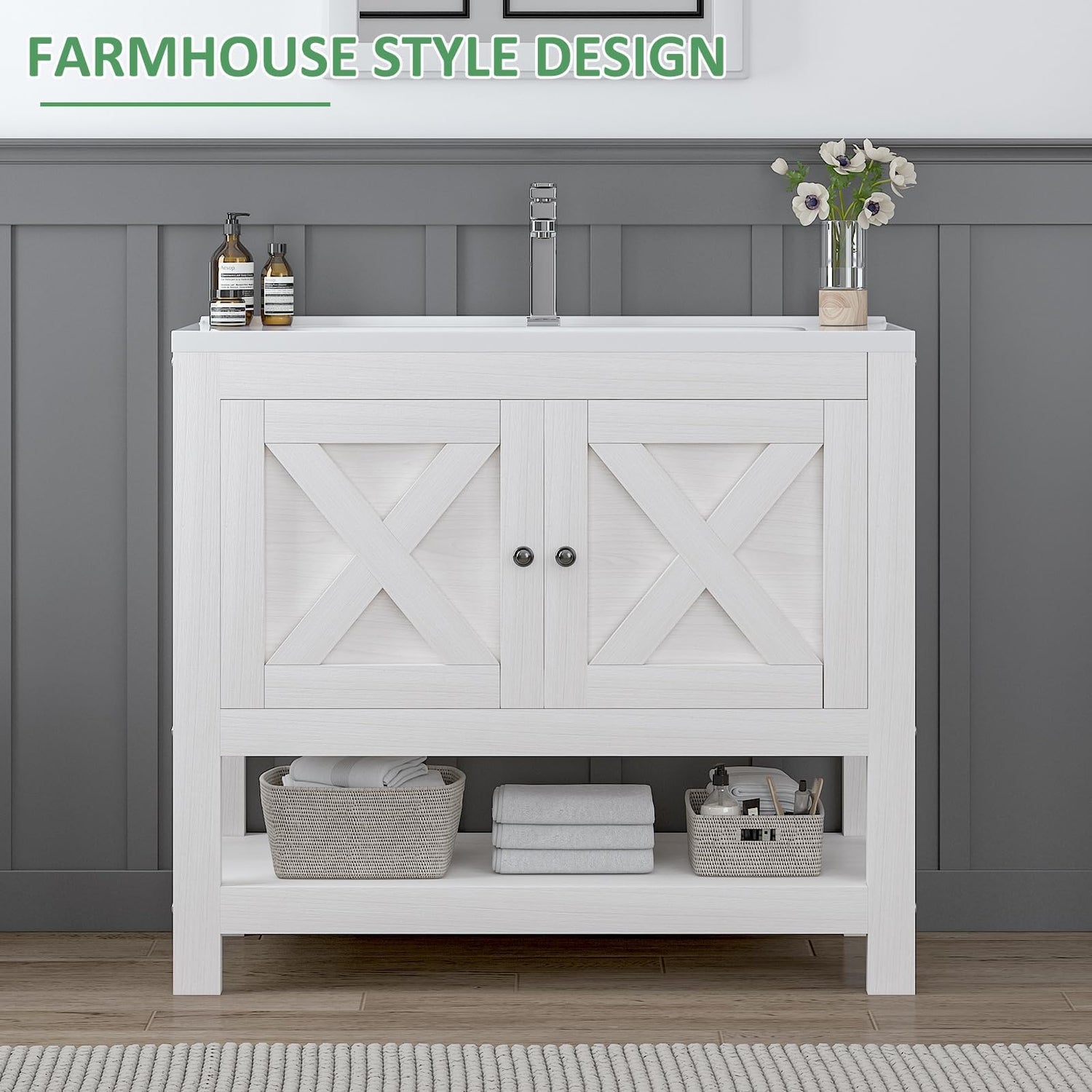 4ever2buy Farmhouse Bathroom Vanity with Sink, 35 Inch Bathroom Vanity Cabinet, Freestanding Vanity, 2 Doors and Open Shelf, Bathroom Cabinet with Ceramic Sink, White