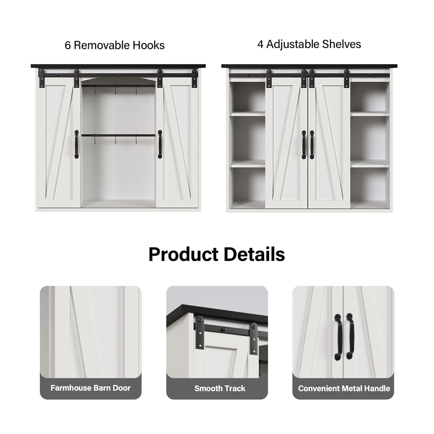 4ever2buy Farmhouse Coffee Bar with Storage, 31.5 Inch Floating Kitchen Wall Cabinet with 6 Hooks for Wall, Wall Mount Cabinet with Barn Door for Living Room, White Kitchen Wall Cabinet