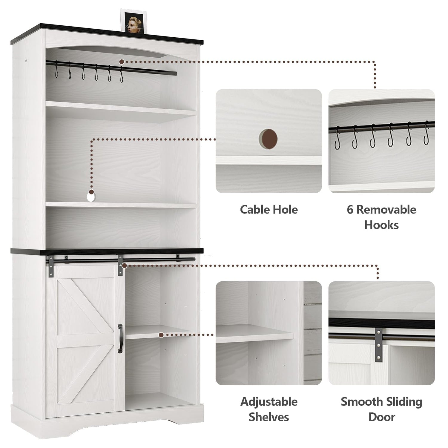 - 7 Storage Spaces for All Your Needs: 3 shelves on top (each a different size): Store cups, plates, or decor on the bottom shelf, tall items like coffee jars on the middle shelf, and use the top shelf with 6 hooks to hang mugs. Middle section: The tallest shelf fits coffee makers, toasters, or microwaves—plus, a hidden cable hole keeps wires neat. Behind the barn door: 2 adjustable shelves let you customize the height for spices, cans, or linens