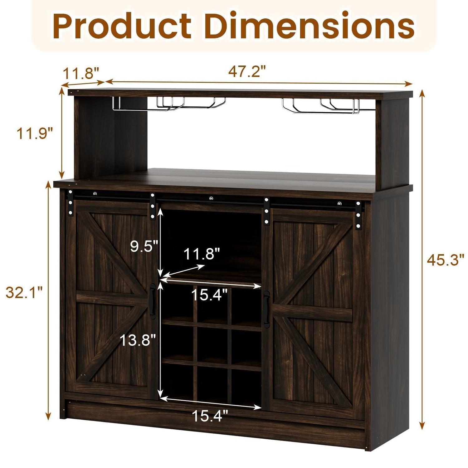 - Ample Storage Space: The 2-tiered cabinets offer upper and lower storage, while the spacious tabletop serves dual purposes. The wine rack includes holders for bottles and glasses, and the sliding barn door design allows easy access to open or hidden areas