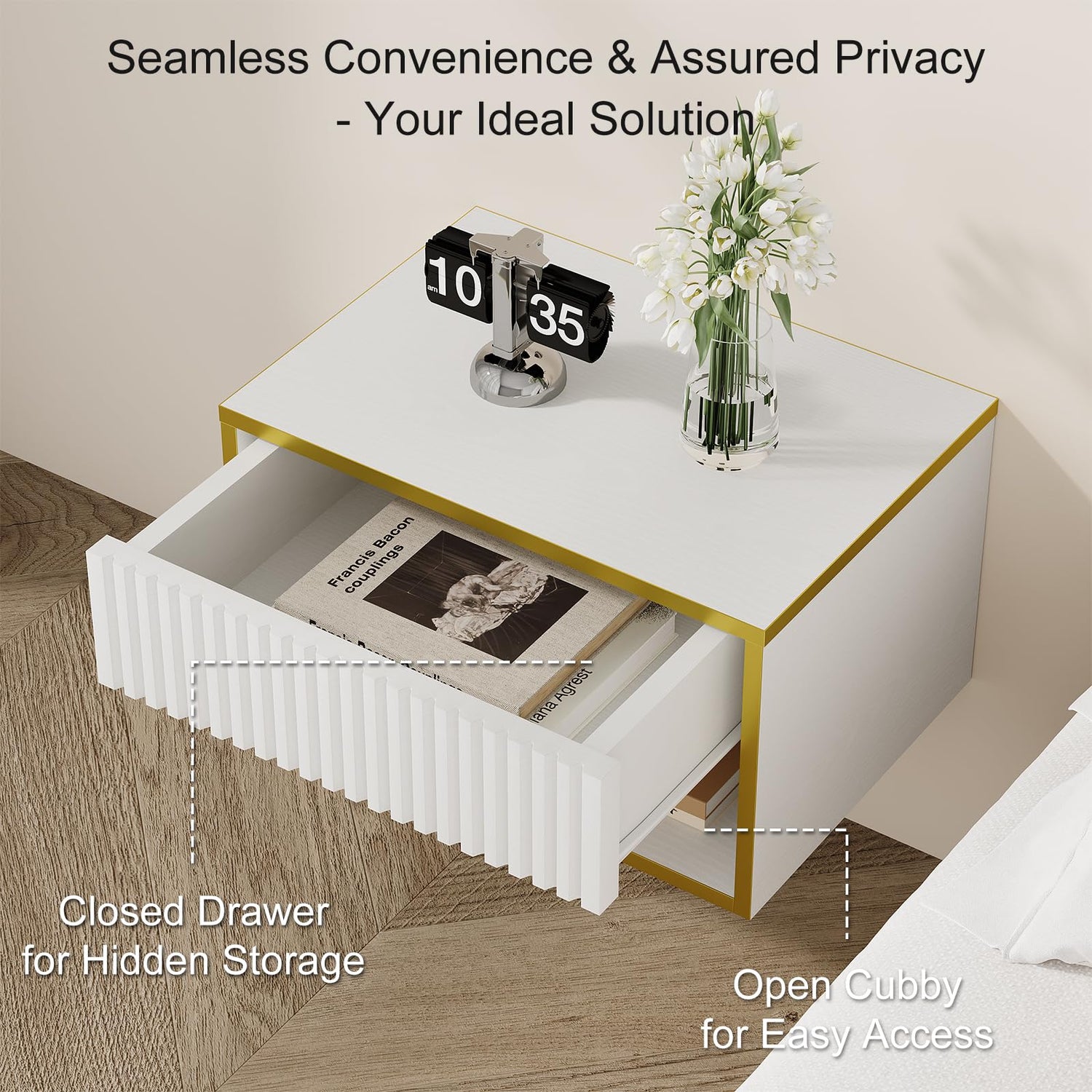 - Elegant Modern Design: This modern floating night stand features a matte white color, vertical fluted drawer, and a gold frame, giving the nightstand an elegantly minimalist and designer look