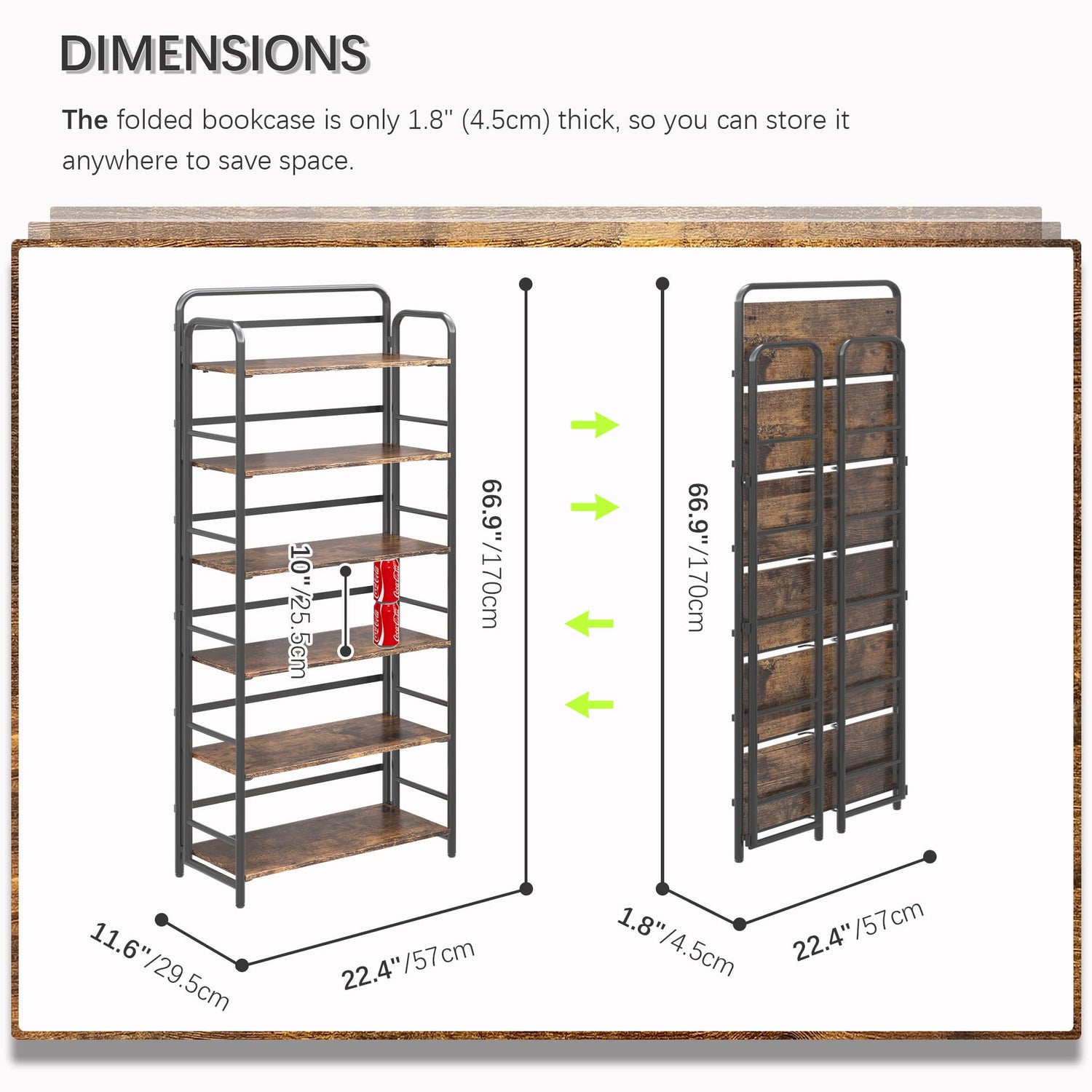 4NM No Assembly Folding Bookshelf, 6 Tier Vintage Industrial Book Shelf,Metal Foldable Storage Bookcase and Bookshelves for Living Room,Bedroom and Kitchen - Rustic Brown