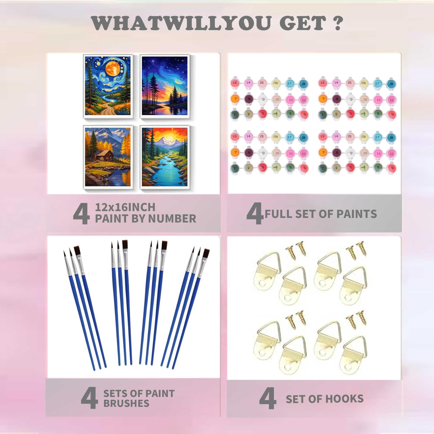 - What You’ll Get: Each set contains 4 digital painting canvases (without frame), 4 set of acrylic paint pots, multiple brushes,Markless screws, hooks