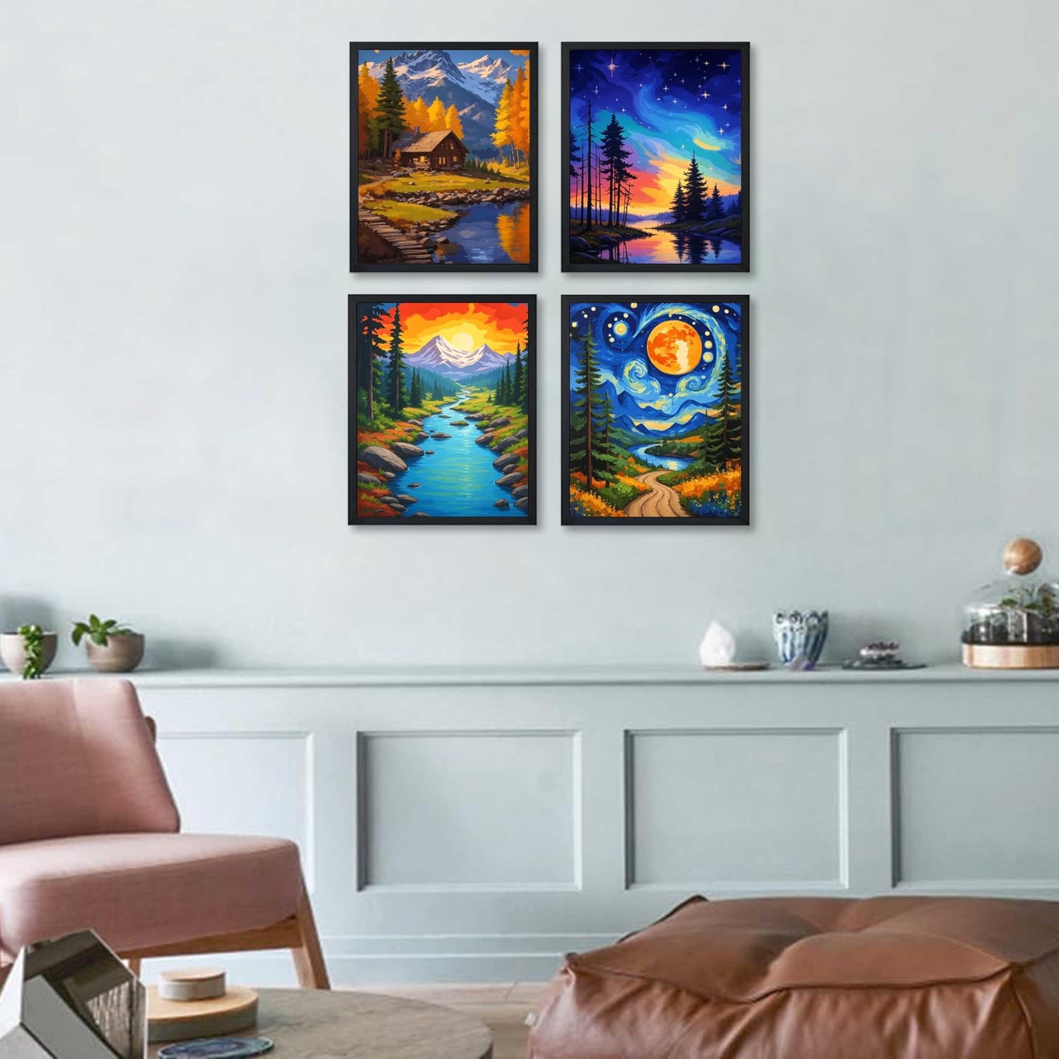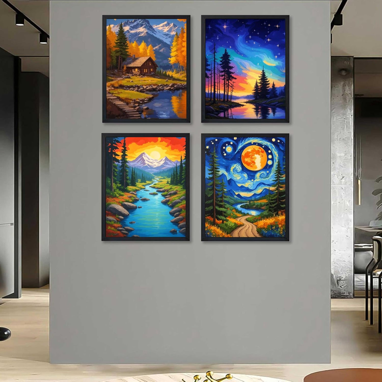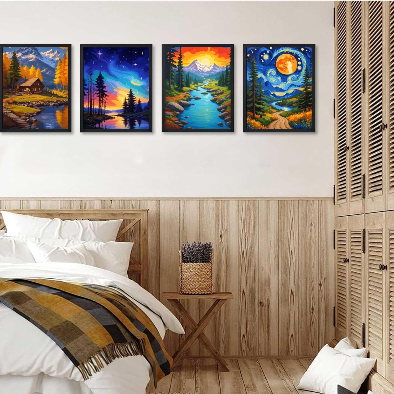 - Breathtaking Nature Themes:4 captivating nature scenes - starry night sky over mountains, cosmic forest lake, sunset mountain stream, and cabin by alpine lake. Bring majestic outdoor beauty indoors