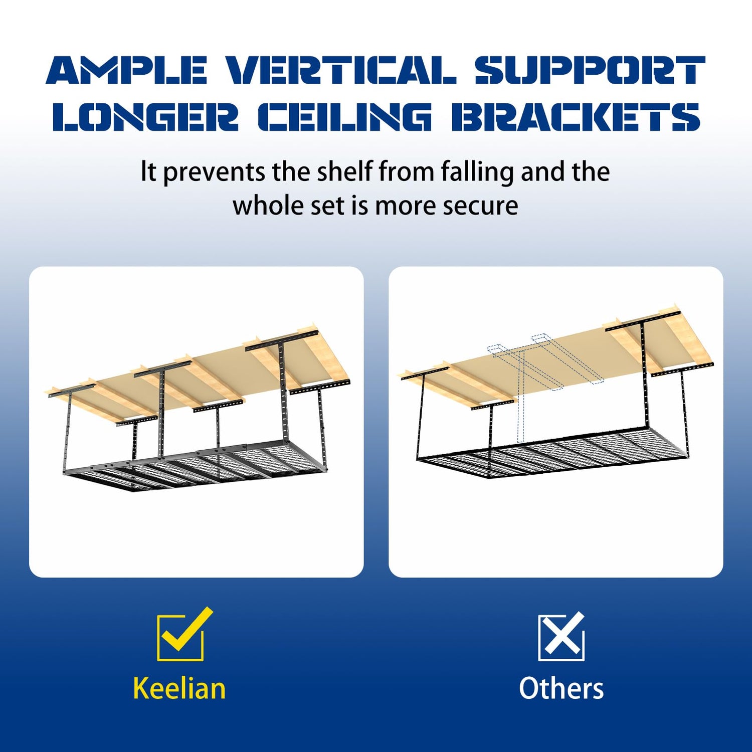 - 【High Load-Bearing & Secure】Our garage hanging storage rack has undergone rigorous load tests to ensure safety and durability, supporting up to 600 pounds of tools and equipment. Built as a robust garage overhead storage rack, it features extended ceiling brackets that attach securely to two studs, along with six vertical posts for enhanced stability.