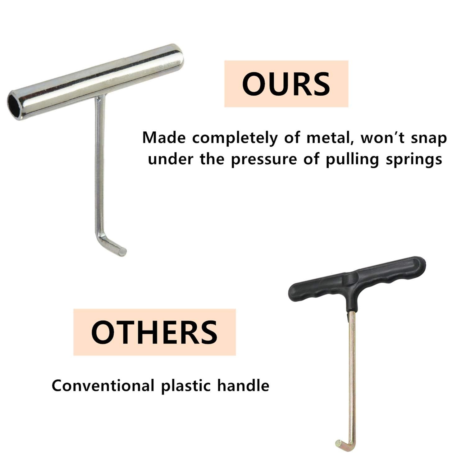 • 【Unique T-hook Spring Pull Tool】Unlike other cheap plastic trampoline spring pullers, our spring pulling tool is made completely of Stainless Steel and is in one piece, much more sturdy and comfortable to use, won’t hurt your hand, makes assembling a trampoline much easier.