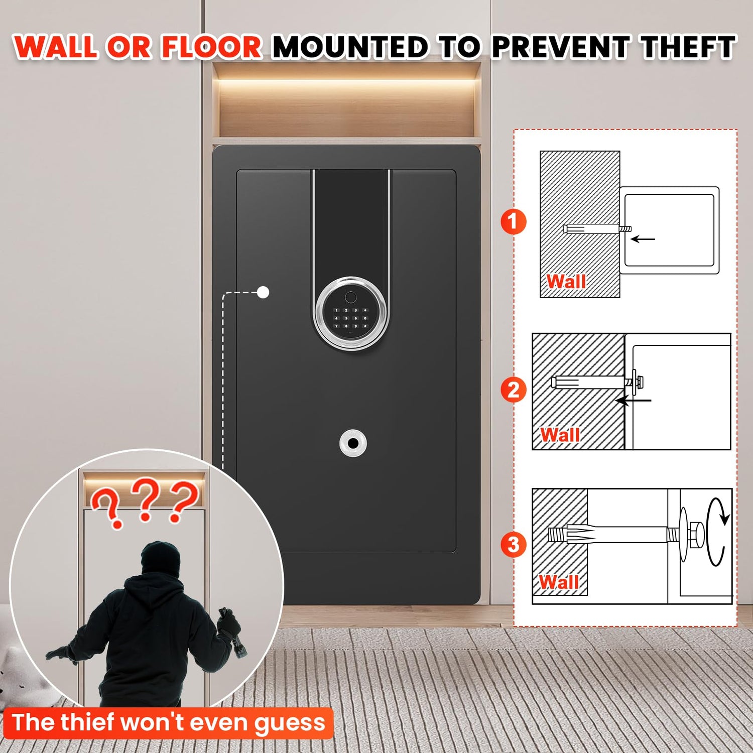 - 【PREVENT THEFT & ANCHORING DESIGN】Our safe equipped with 4 expansion bolts and pre-drilled holes,which is easy to install on wall and prevent theft or movement.The classic black design makes it easy to hide in any corner of your home or office .It's perfect for bedroom wardrobe, closet , living room, office walls, hotel