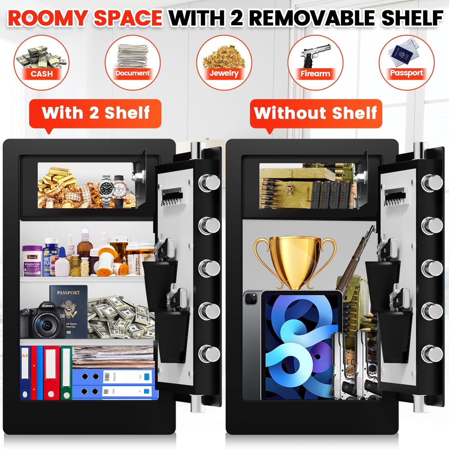 - 【EXTRA LARGE WELL-ORGANIZED HOME SAFE 】: Roomy Interior size of 16''W * 14.5''D * 27''H more than sufficient for guns, money, jewelry, documents and has a inner lockbox and two shelves to split the safe in four compartments or remove for full use of larger items. Key hooks and two pockets are great for holding keys or other small items