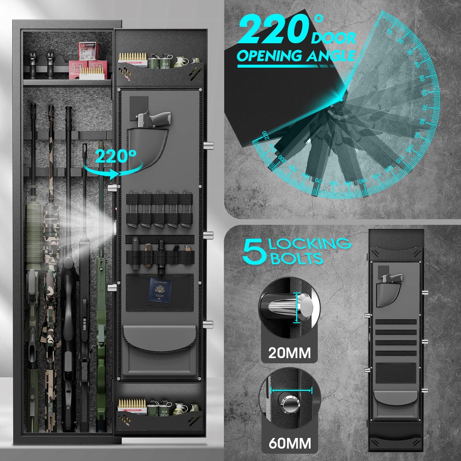 - 【Comprehensive Gun Safe for Rifles and Pistols】This all-in-one gun safe accommodates both rifles and handguns. It features 2 metal storage compartments and 1 handgun bag on the door for storing handguns, casings, and ammunition; plus a newly added a whole storage bags to hold magazines, handguns, or other valuables. The 220° door opening angle enables faster and easier access to your firearms.