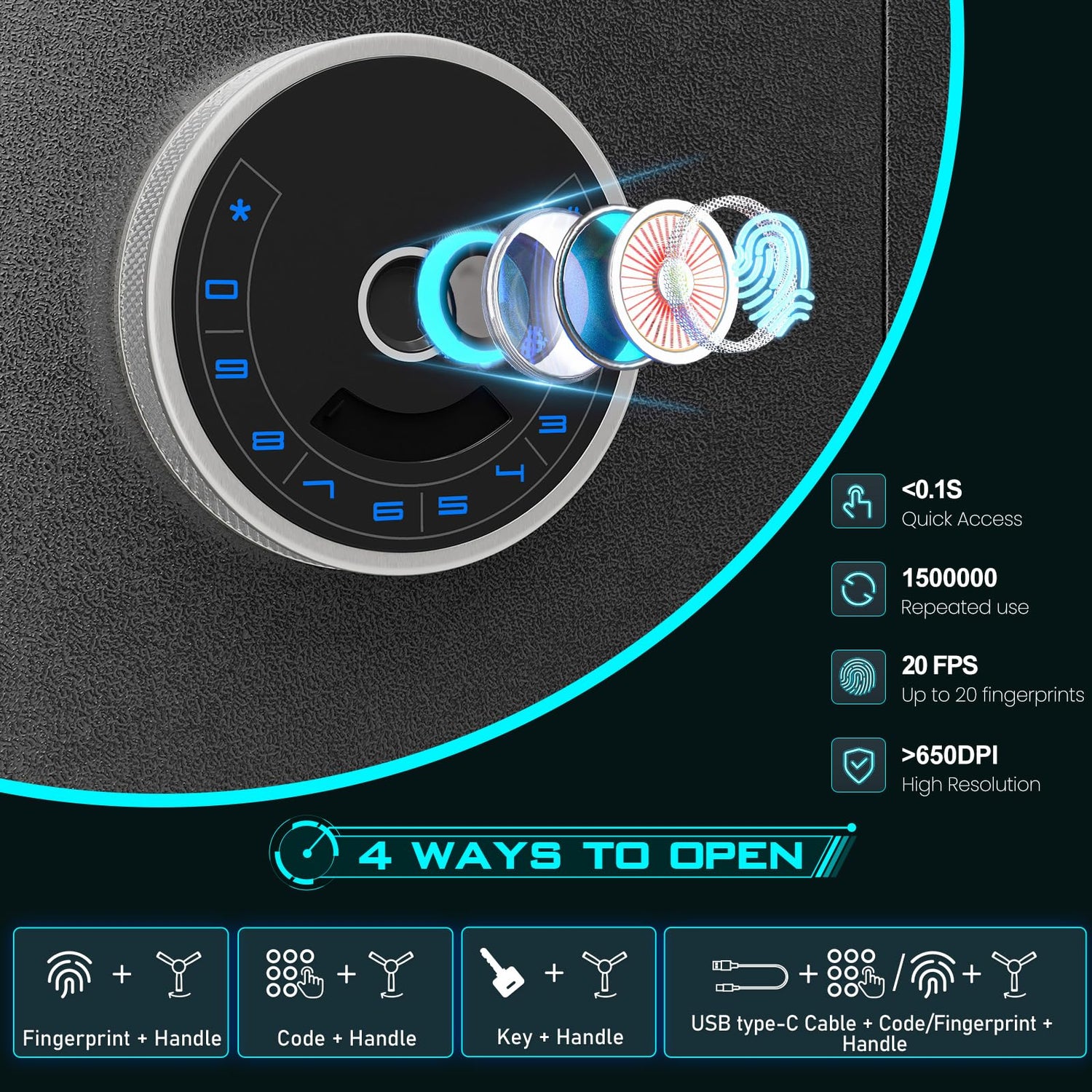 - 【Quick Access Gun Safe for Rifles and Shotguns】Our gun safes are developed and designed in the U.S., featuring digital backlit touch keypad. The Luzfuego gun safe is equipped with the latest upgraded biometric fingerprint recognition technology, allowing it to quickly open in just 0.1 seconds with a high-resolution DPI fingerprint scanner, saving you more time in critical moments. It can store up to 20 sets of fingerprints, so you can grant access permissions to trusted individuals.