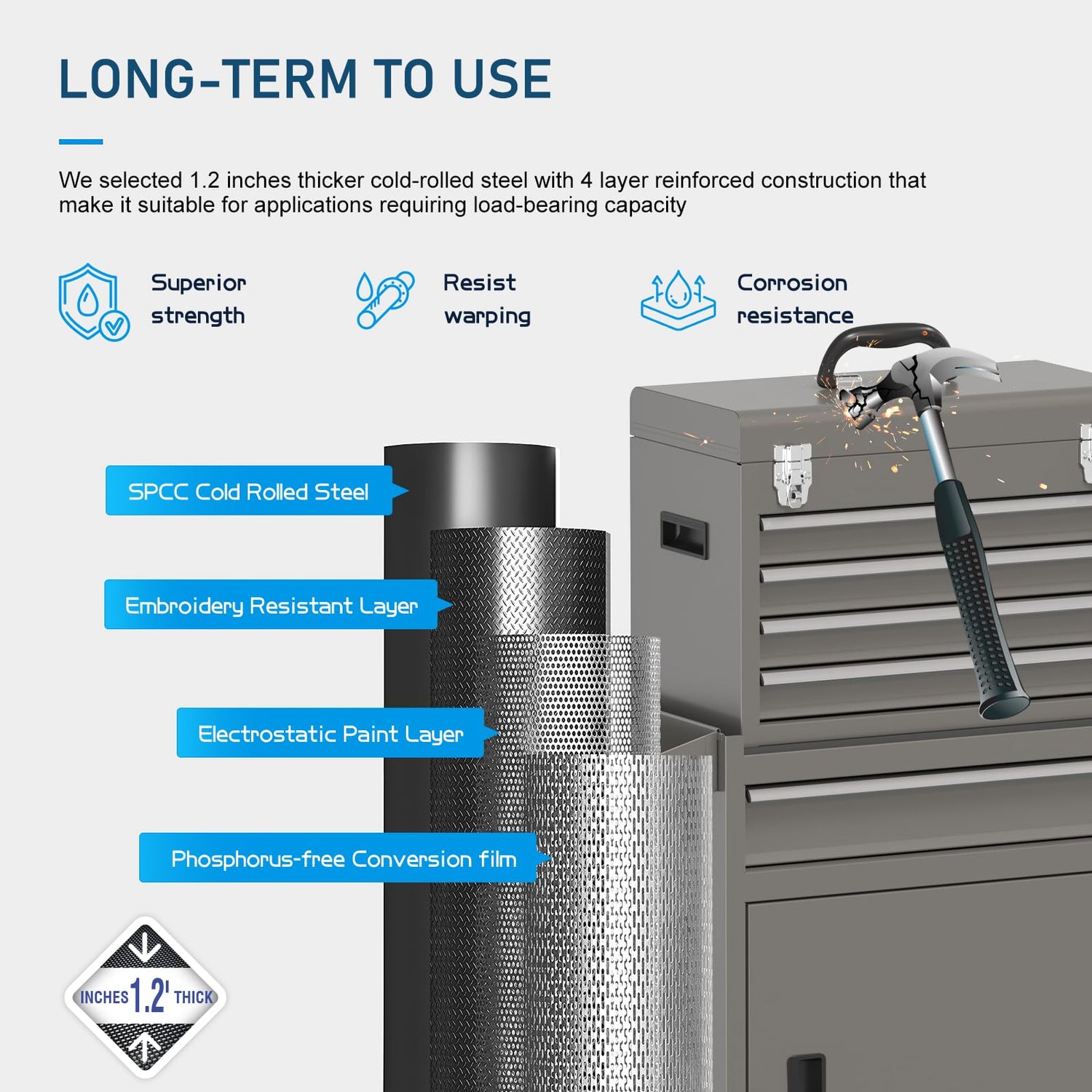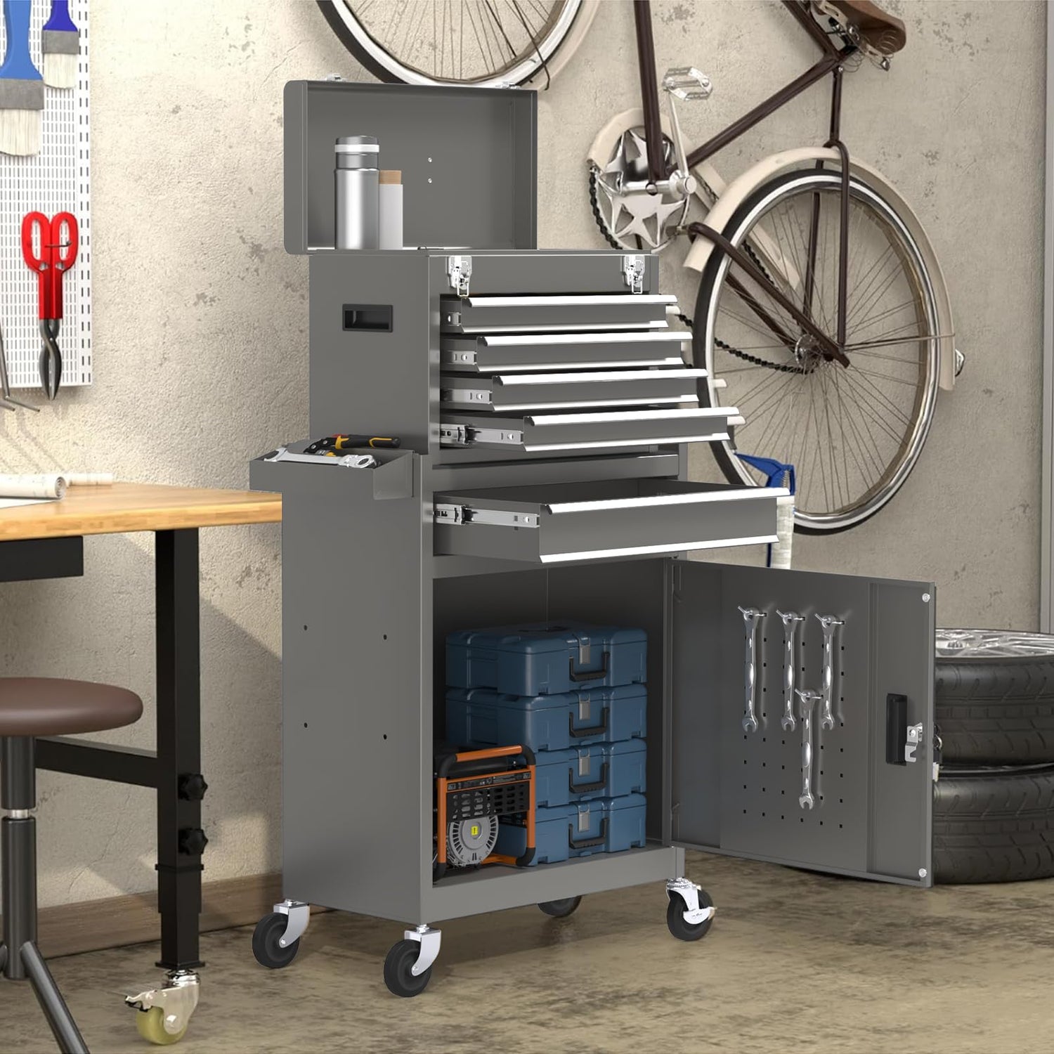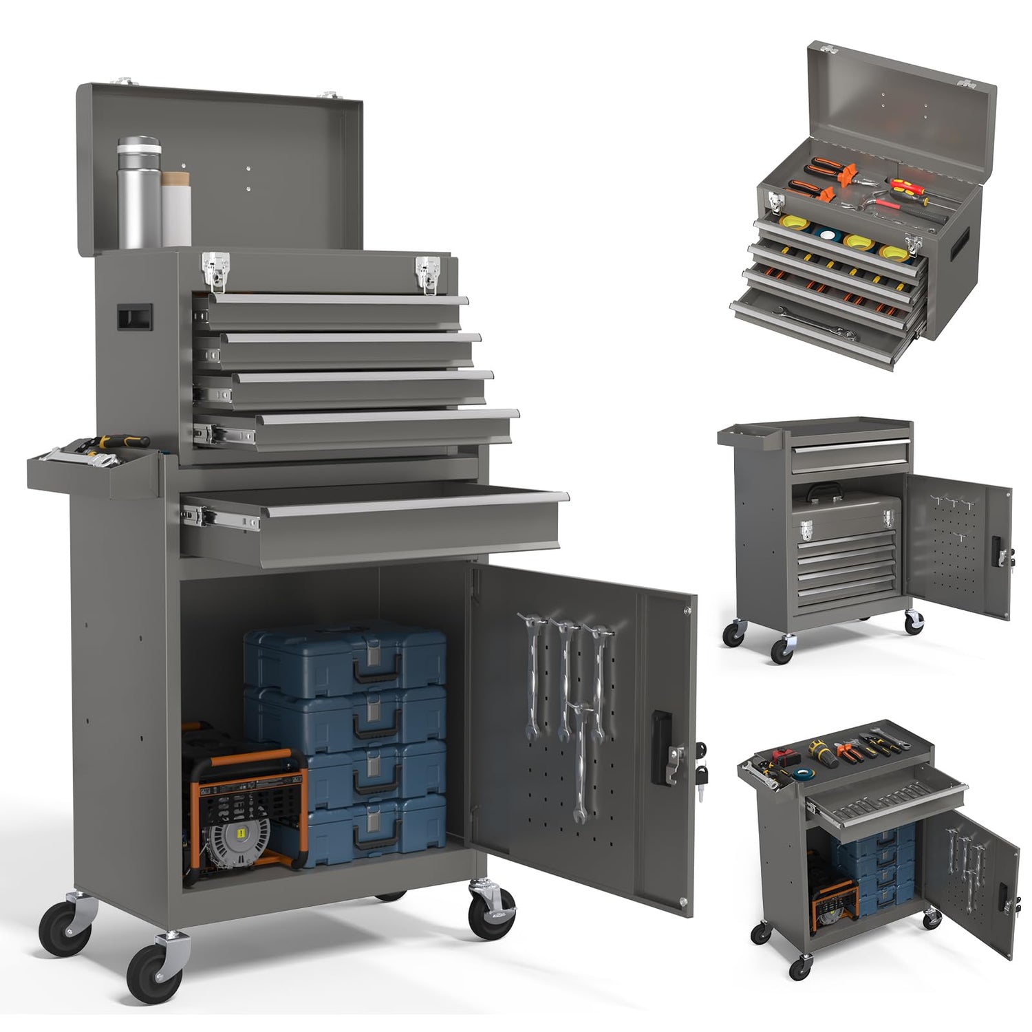 5-Drawers Gray Tool Chest, 2-in-1 Mechanic Rolling Tool Box Removable Lockable Tool Storage Cabinet, Metal Tool Cart with Drawers and Wheels for Garage, Workshop