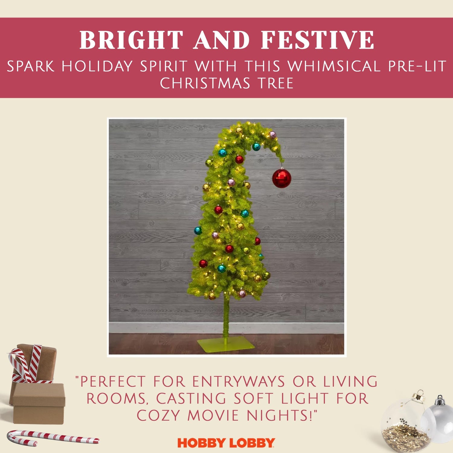 Details: Hobby Lobby’s Whimsical Artificial Small Christmas Tree (5 Ft): This fun and whimsical 5 ft artificial Christmas tree tabletop accessory from Hobby Lobby makes a unique addition to any holiday decor. The 5 ft tree features a funky design with a full metal square base that narrows into a looping curl at the top. The branches of the 5ft Christmas tree are needled and ready to be shaped for a flocked look. 268 tips and the iconic bright green color. Decorate your 5 ft Christmas trees with classic ball ornaments in a color scheme to match, then hang a large ball ornament from the tip to complete the look. These small Christmas trees can be placed in the entryway as a great fixture for welcoming guests for a holiday party or in the living room to exchange gifts . 5 foot Artificial Christmas Tree Number Of Tips: 534 - Number Of Sections: 3 - Stand: Square Metal Flat Weight: 12.36lbs --- Dimensions: Tree Width: 20" - Tree Height: 5 Foot - Stand Dimensions: 14" x 14" - Box Length: 27" - Box Width: 9.5" - Box Height: 15"