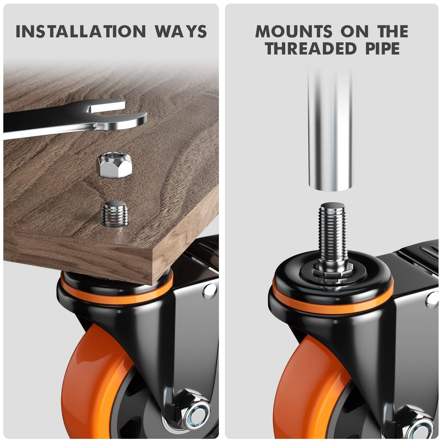 - STANDARD AMERICAN SIZE 1/2" -13UNC x 1": Please measure the stem size of your old thread dual locking caster wheels with brakes before purchasing. Our cart wheels screw size is 1/2" -13x1" (Screw Diameter 1/2", Screw Length 1"). The castor wheels are quickly attached to medium and large equipment like workbench, trolley, carts etc.