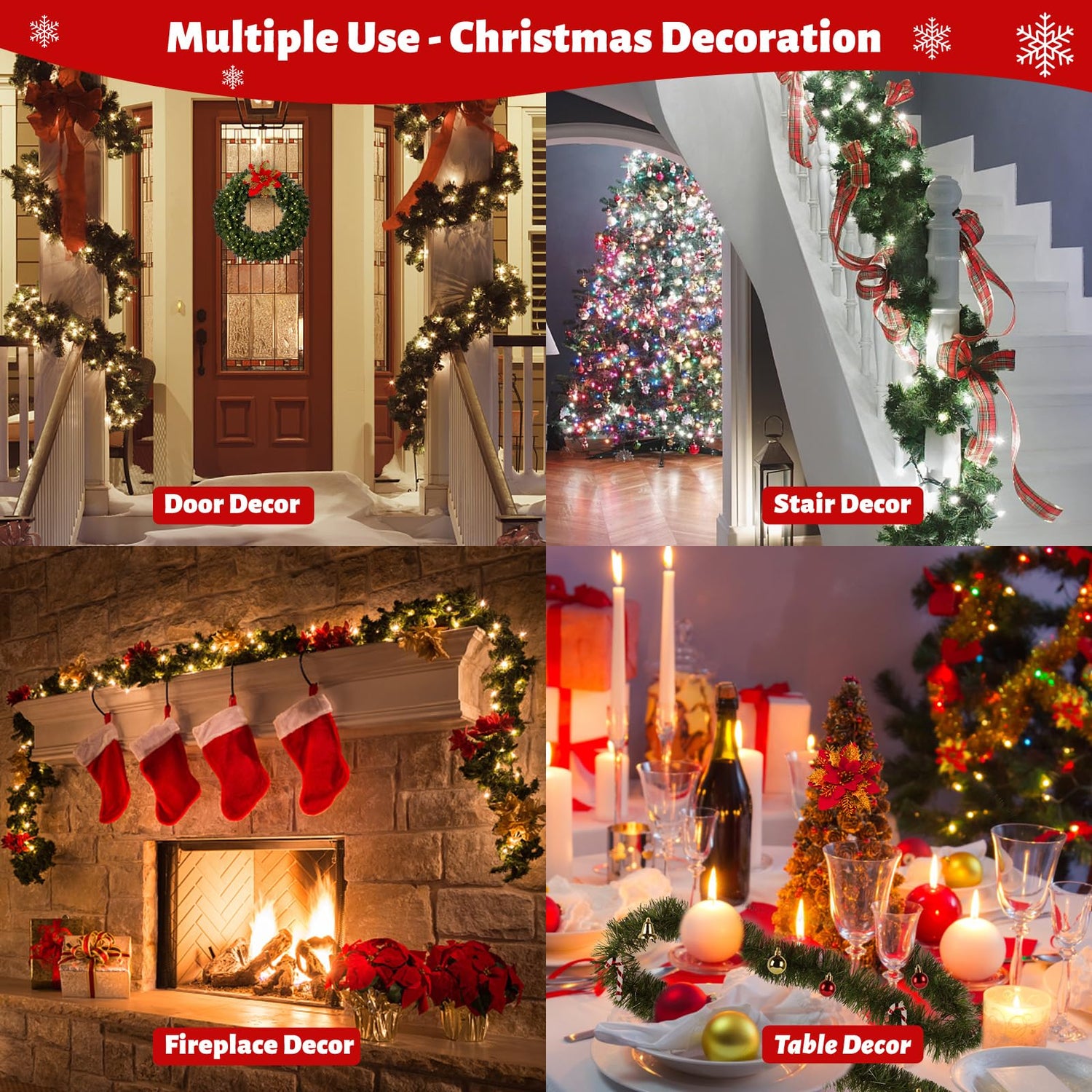 - đăWide ApplicationăGarlands for Christmas Decorations suitable for Christmas party decoration indoors or outdoors in home, garden, patio, office or anywhere. Perfect for decorating in home like door and window frames, banister, staircase, mantle, fireplaces etc. Perfect for outdoor Christmas garland around trees, pillars, bushes or porch etc. Suitable for wreath making, table setting, craft decorating, wedding party. Our greenery artificial garland are ideal for creating Christmas atmos