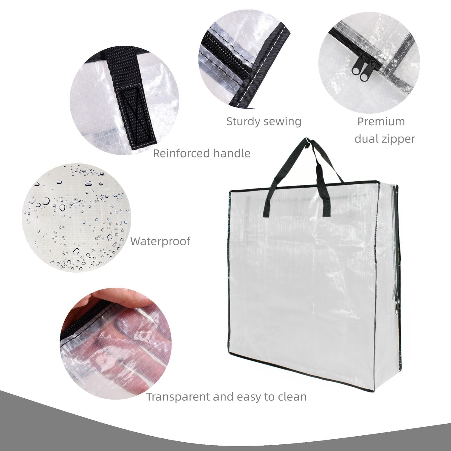 - SEE-THROUGH DESIGN: The transparent design of our packing bags for moving allows you to easily view the contents of the storage, enabling quick identification without the need to search or open the bag. At the same time, clear zippered storage bags ensures that your items are protected from water, dust, and dirt, ensuring long-lasting durability.