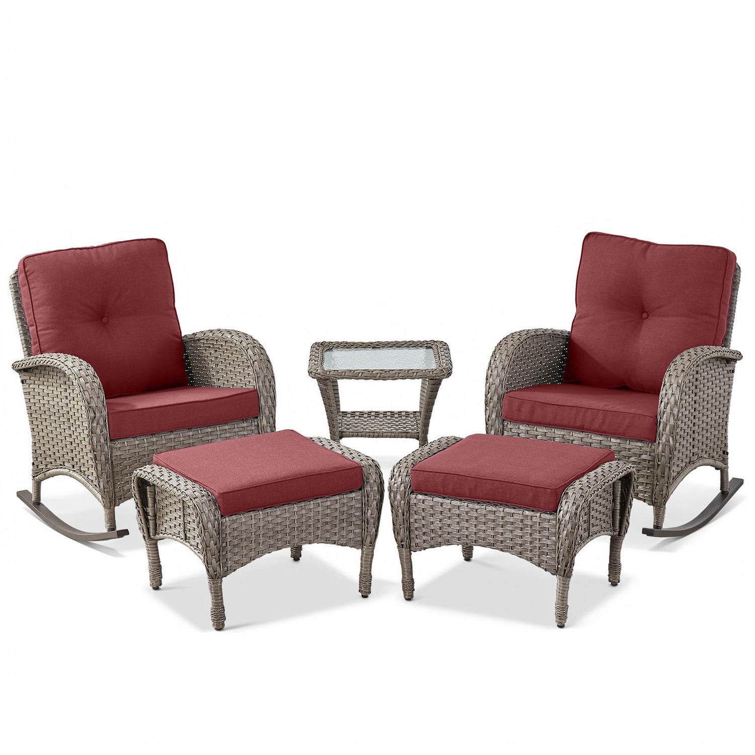 5 Piece Patio Rocking Chairs Furniture Set - Outdoor Wicker Furniture with Ottomans and Side Table, Rattan Conversation Bistro Set for Porch Balcony Backyard
