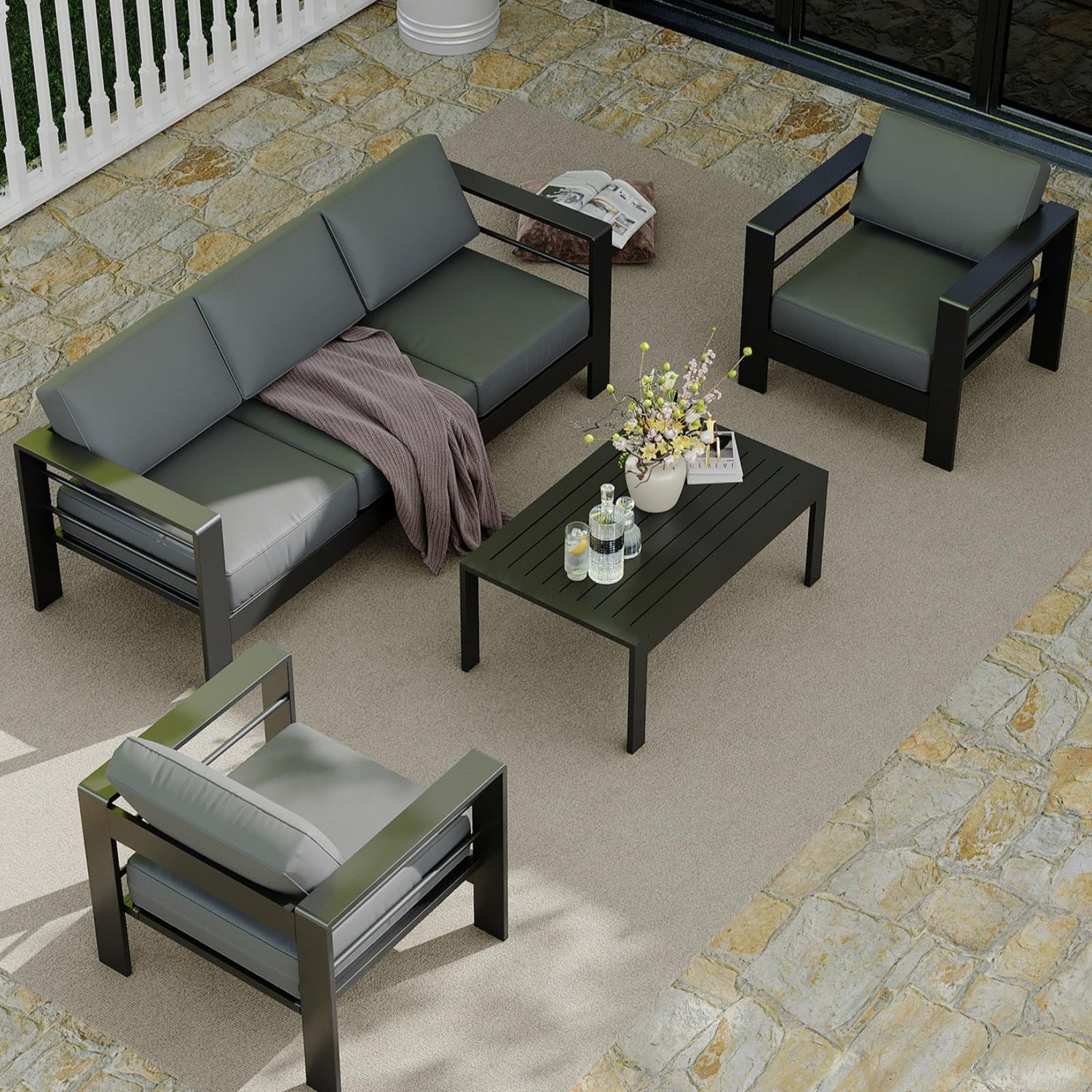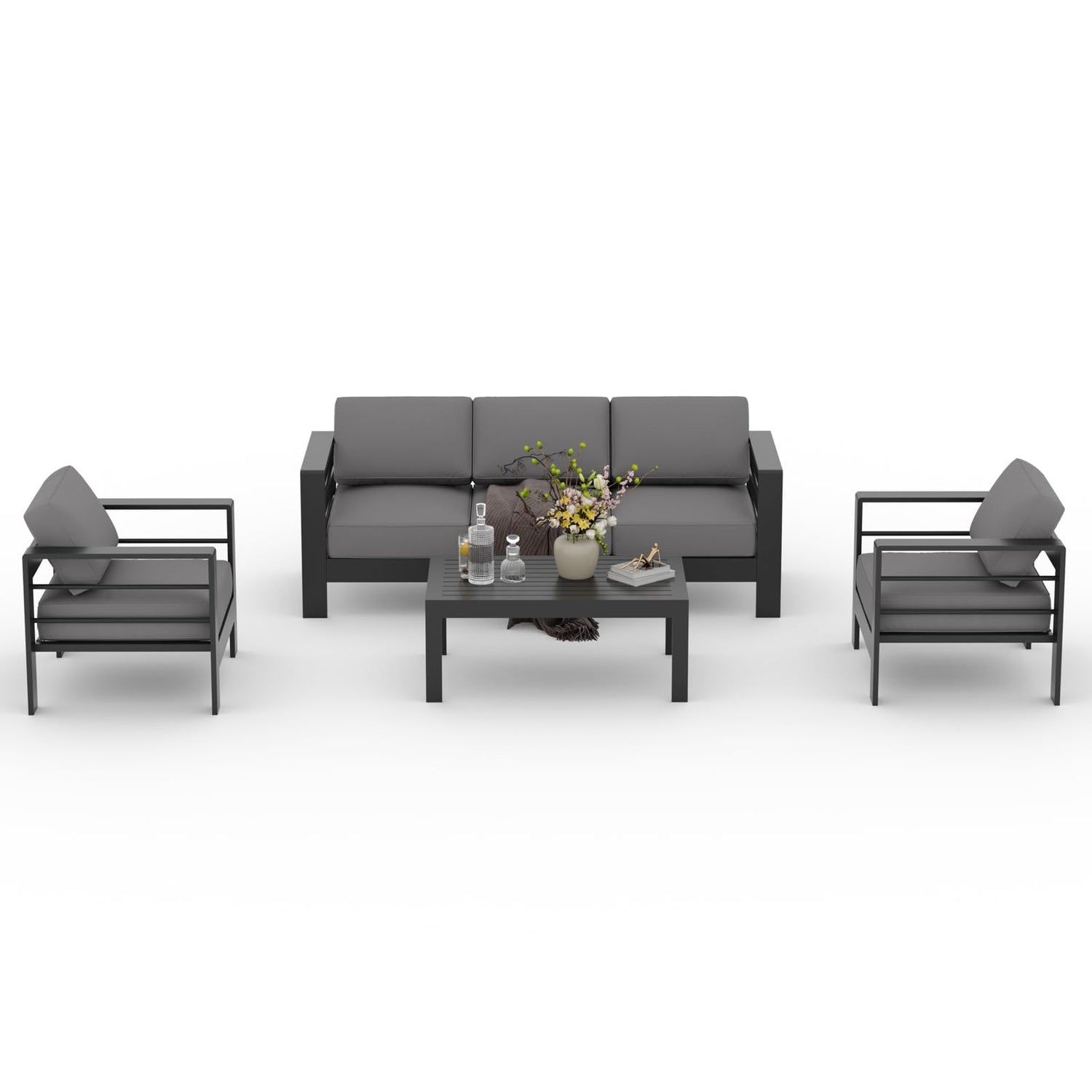 5 Seats Aluminum Patio Furniture Set, 4 PCS Outdoor Sectional Conversation Set with 4" Wide Armrest, Backyard Sectional Sofa Set with Coffee Table & Thick Cushions, Grey
