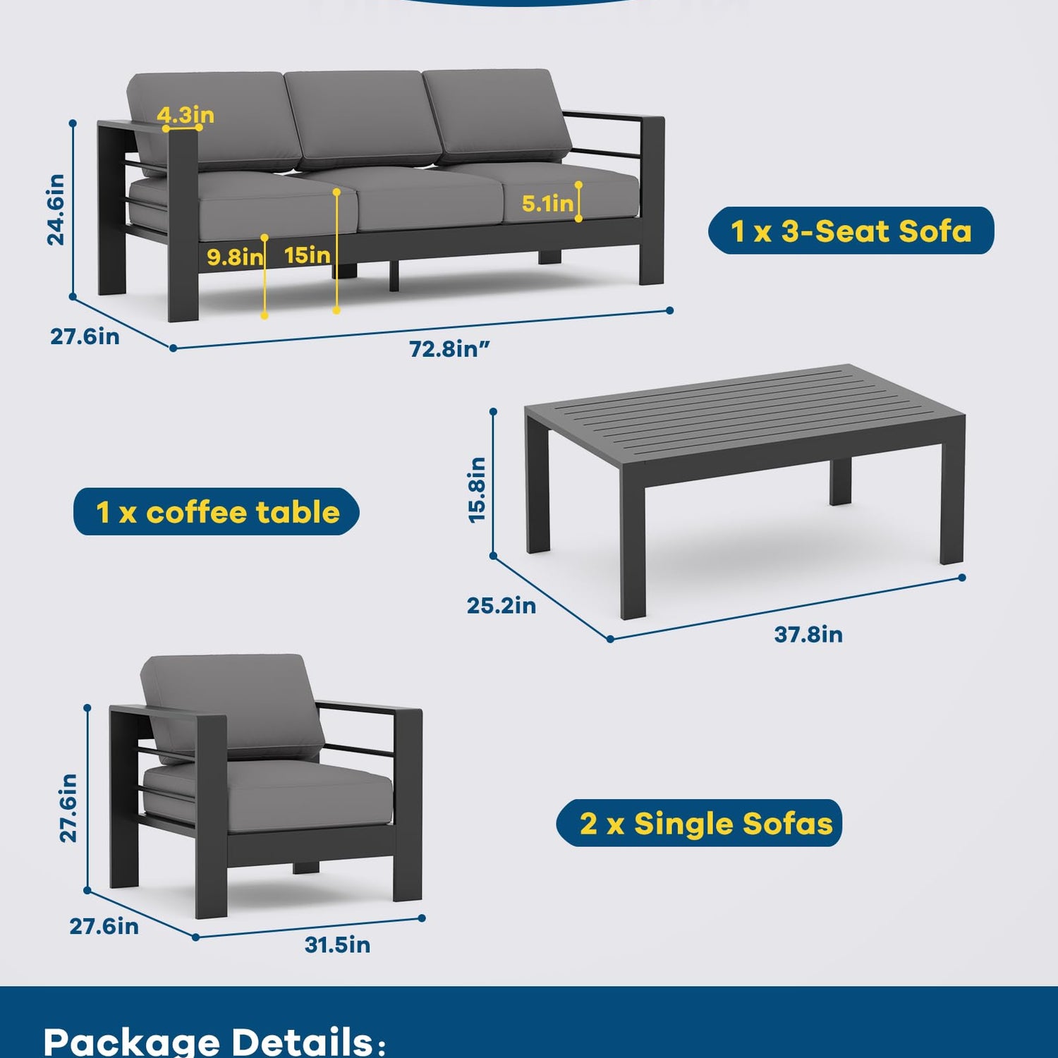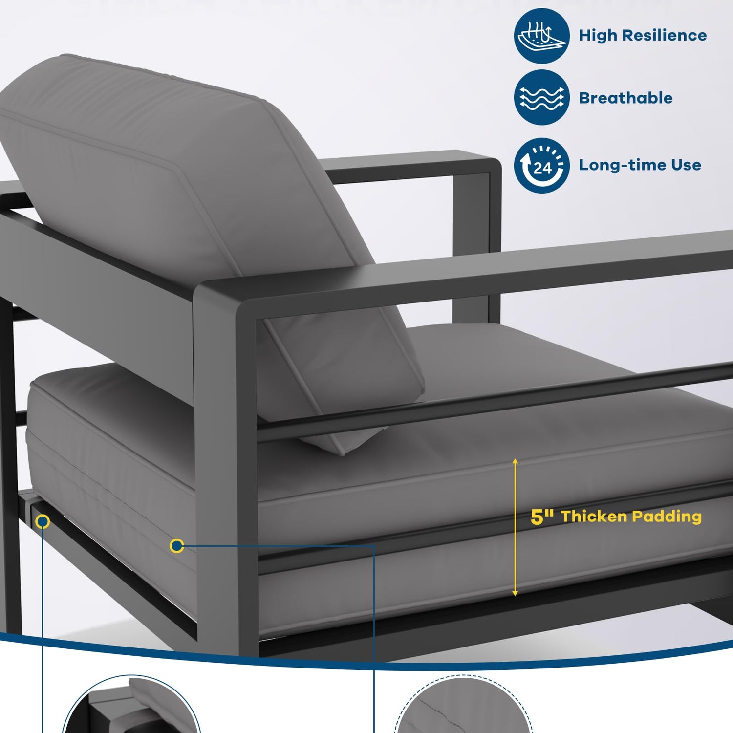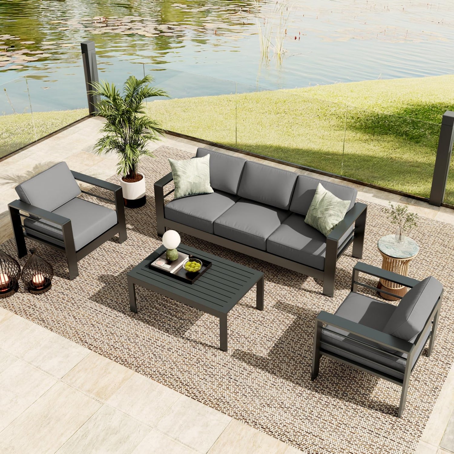 - ALL-ALUMINUM BUILD: Engineered with aluminum frames, this patio furniture set resists rust, UV damage, and coastal humidity. Sturdy joints and reinforced legs ensure stability on uneven decks, grassy lawns, or poolside pavers.