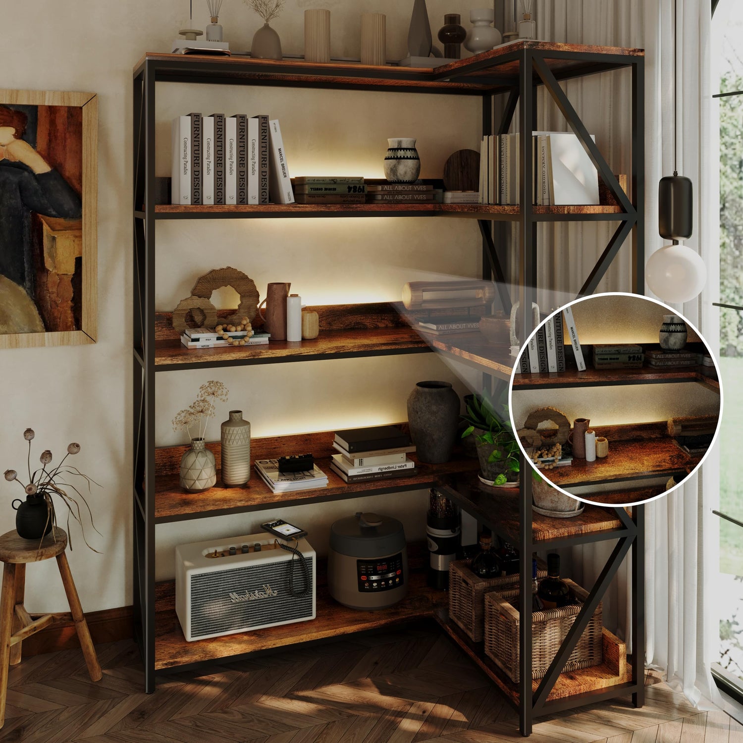 5 Tier Bookshelves with LED Plant Grow Lights, Convertible Corner Bookshelf with Baffles, 70" Tall Industrial Bookcase, Display Shelf, Wood Shelves with Metal Frame for Living Room Bedroom Home Office