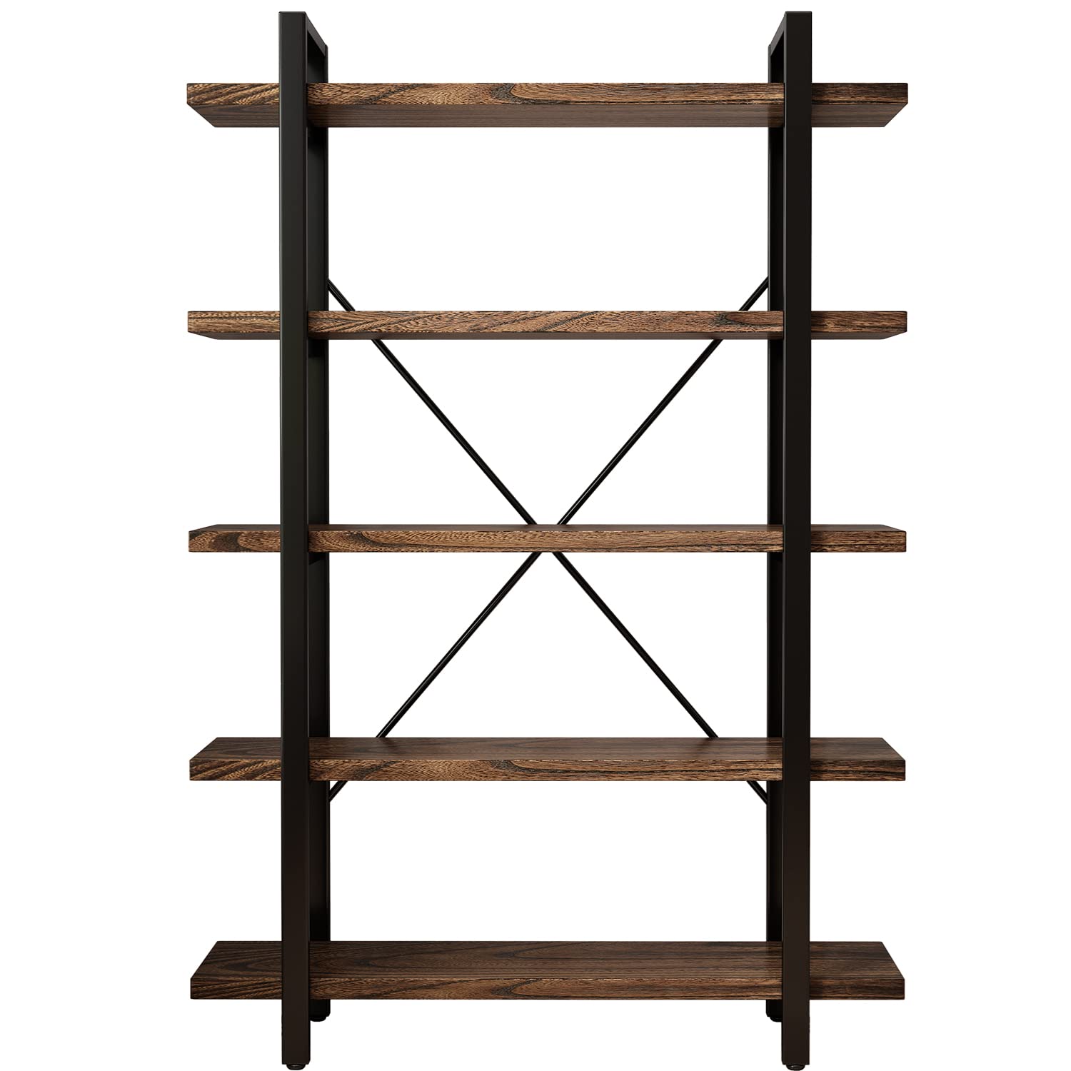 5-Tier Rustic Industrial Solid Wood Bookcase with Metal Frame