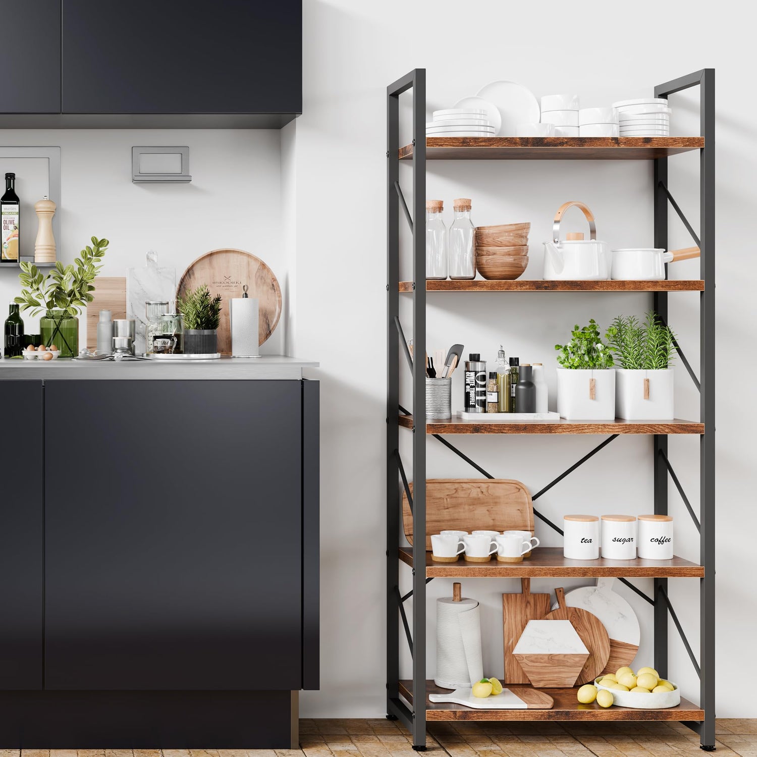 5 Tiers Bookshelf, Classically Tall Bookcase Shelf, Industrial Book Rack, Modern Book Holder in Bedroom/Living Room/Home/Office, Storage Rack Shelves for Book, Brown