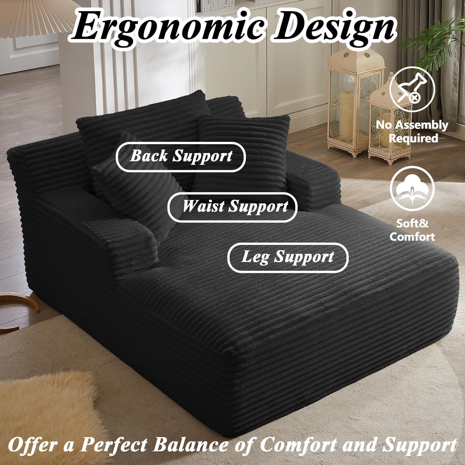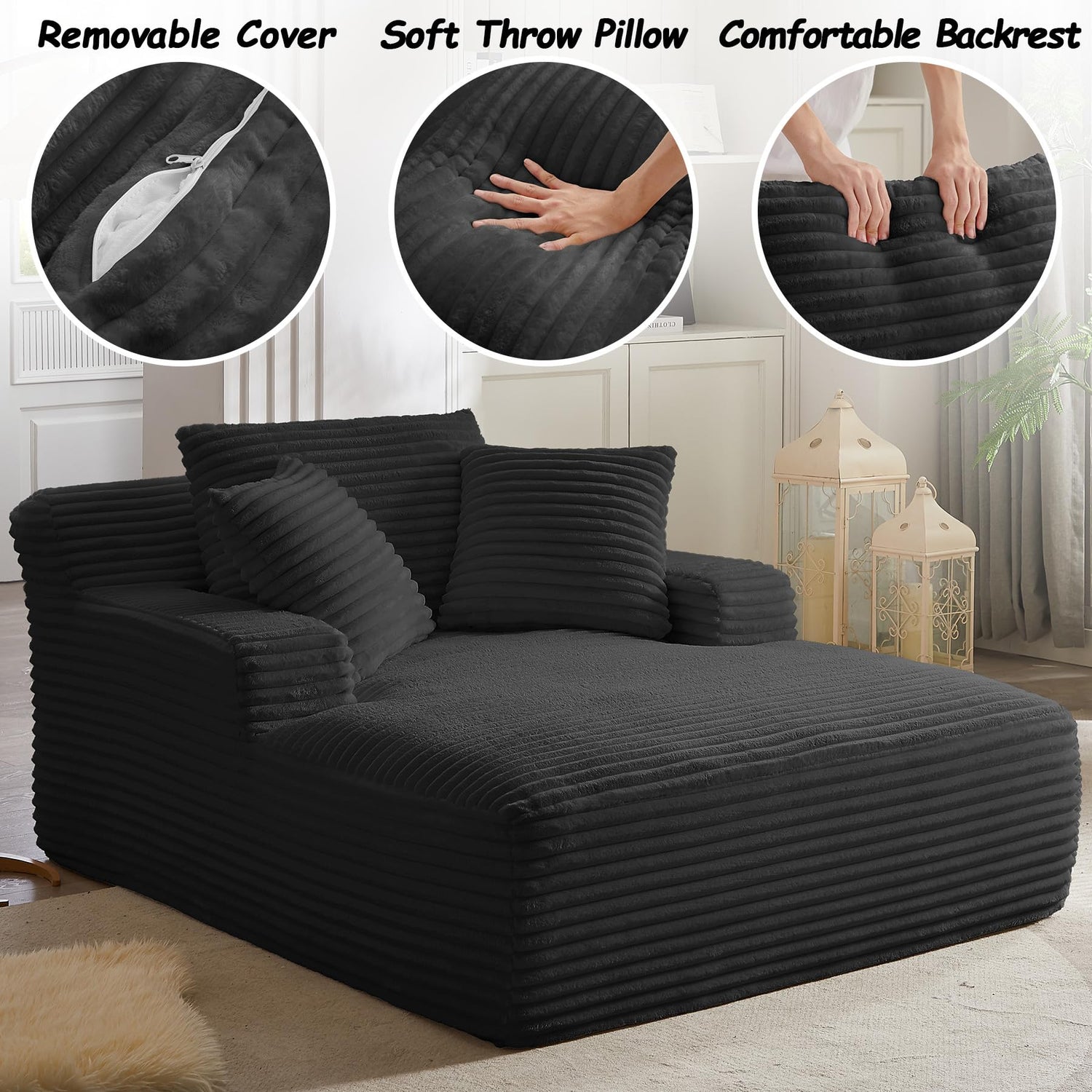 50" Boneless Couch, Oversized Chaise Lounge Sofa, Corduroy Chaise Lounge Chair Indoor with Comfy Pillows for Living Room Bedroom, Foam Filling, No Assembly (Black)