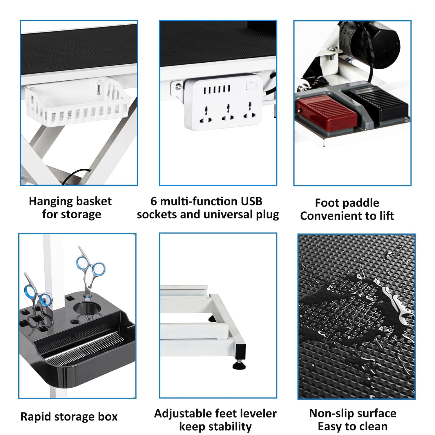- The ultimate grooming solution, this dog grooming table offers a portable caddy for grooming tools and organizes the grooming area so groomers can focus on their craft; AC outlet and USB port add-on for easy access to grooming equipment.