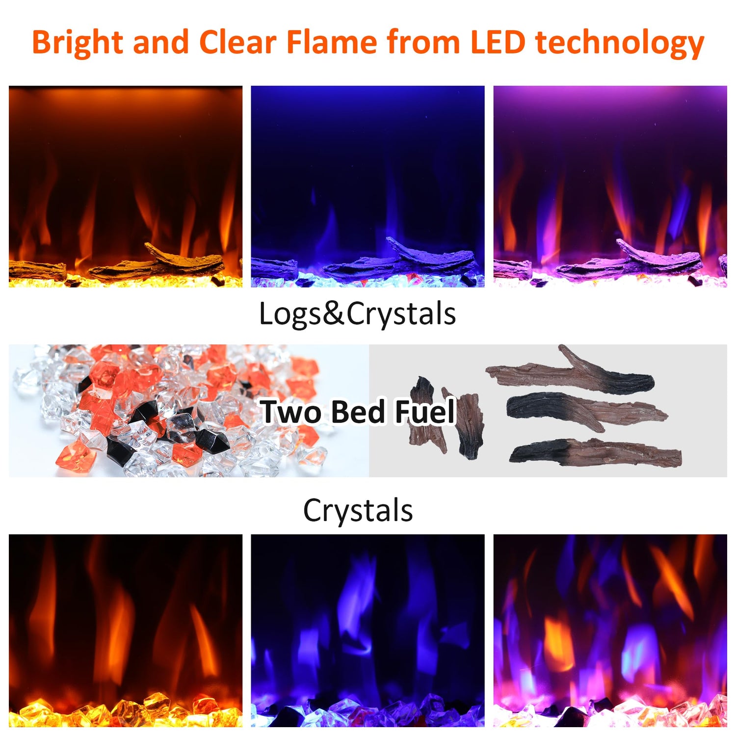 - 🔥Realistic Flame & Modern Décor: Realistic logs & crystal clear cube ember beds can be used separately or mixture for various visual effects. 3 colors of top light and 3 colors of flame, combine freely to create a warm atmosphere. Stream linear, thin and glossy appearance of this electric fireplace highlights the modern style and is suitable for a variety of home decoration styles.