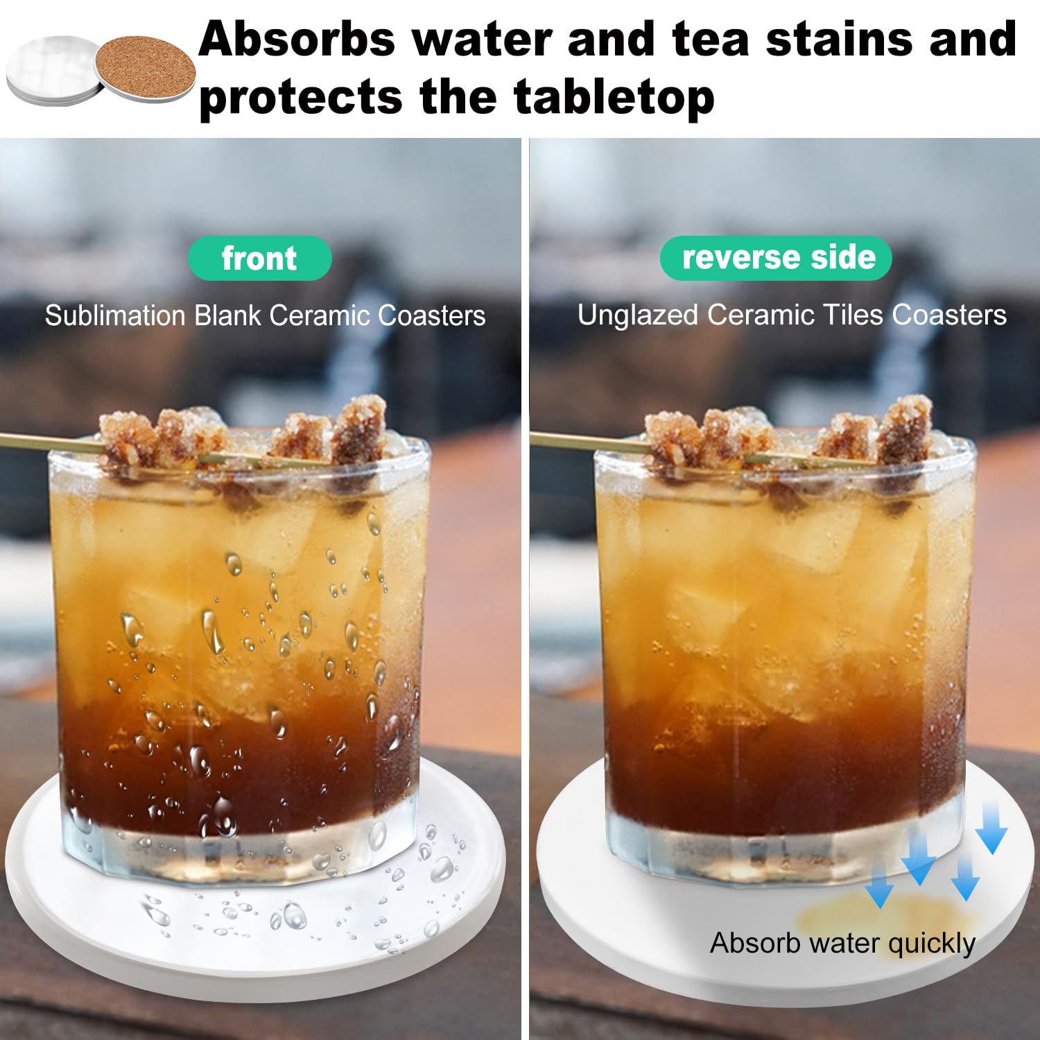 - 【Protects Your Furniture】: Made from stone absorbent ceramic with a natural cork base, these Sublimation coasters provide a protective layer between your drink and the tabletop. The cork base prevents scratches and ensures a non-slip surface, keeping your furniture safe and secure.