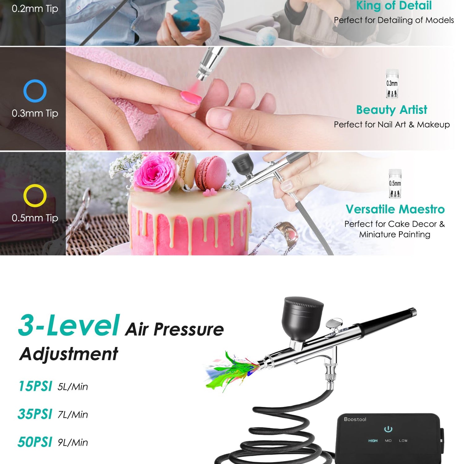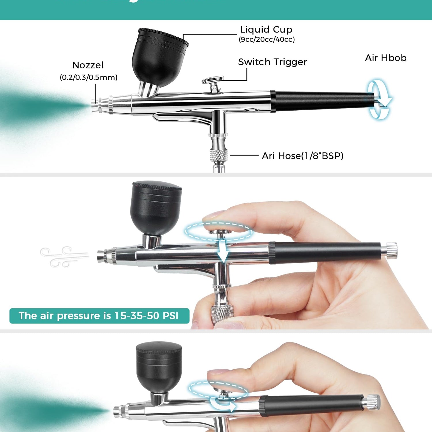 - 【Dual-Action Airbrush Gun】 Equipped with three different precision nozzles (0.2 mm/0.3 mm/0.5 mm) and an ergonomic handle design., our airbrush gun delivers 360° spray pattern control with gravity-feed aluminum bottle. Achieve hair-thin lines (0.3mm) to 5cm wide coverage. Ideal for detailed artwork on models, nail art designs, cake decorating, and model painting.