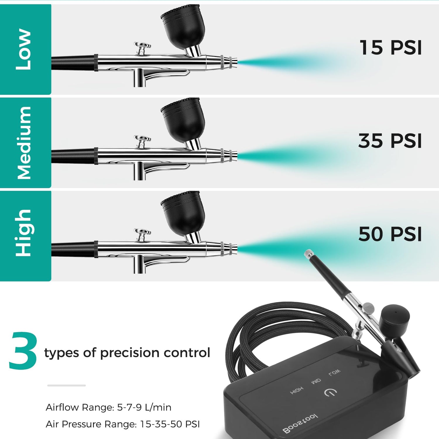 - 【3 types of Precision Control】 The nail airbrush machine has 3 flow settings (5 l/min, 7 l/min, 9 l/min) and adjustable pressure from (15PSI, 35PSI, 50PSI) , allow you to fine-tune the pressure for a delicate skincare spray or a high-coverage spray. Enjoy smooth, clog-free performance and consistent airflow forprofessional-grade results every time.